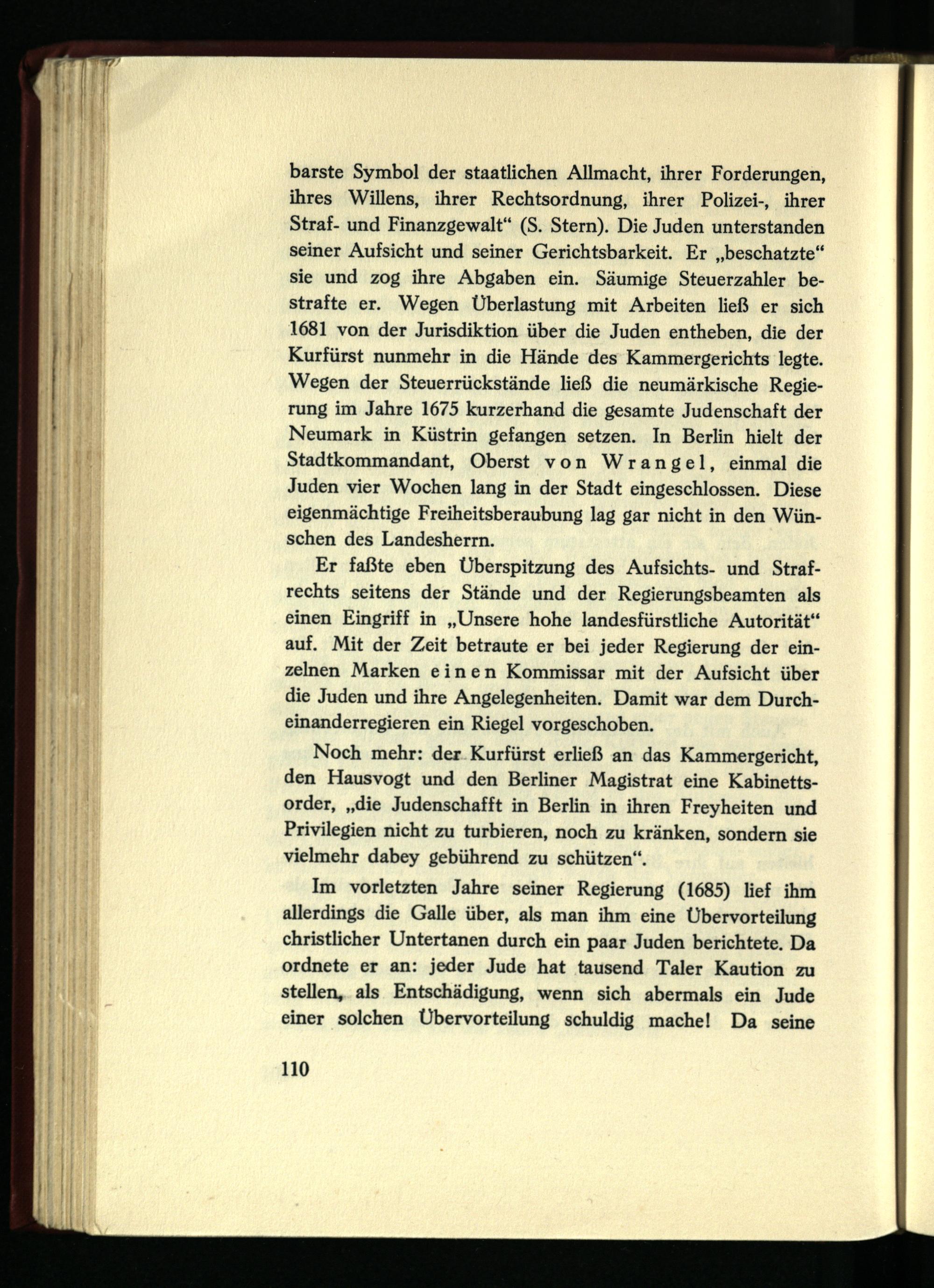 barste Symbol der staatlichen Allmacht, ihrer Forderungen, ihres Willens, ihrer Rechtsordnung, ihrer Polizei-, ihrer Straf- und Finanzgewalt“ (S. Stern). Die Juden unterstanden seiner Aufsicht und seiner Gerichtsbarkeit. Er „beschatzte“ sie und zog ihre Abgaben ein. Säumige Steuerzahler bestrafte er. Wegen Überlastung mit Arbeiten ließ er sich 1681 von der Jurisdiktion über die Juden entheben, die der Kurfürst nunmehr in die Hände des Kammergerichts legte. Wegen der Steuerrückstände ließ die neumärkische Regierung im Jahre 1675 kurzerhand die gesamte Judenschaft der Neumark in Küstrin gefangen setzen. In Berlin hielt der Stadtkommandant, Oberst von Wrangel, einmal die Juden vier Wochen lang in der Stadt eingeschlossen. Diese eigenmächtige Freiheitsberaubung lag gar nicht in den Wünschen des Landesherm.