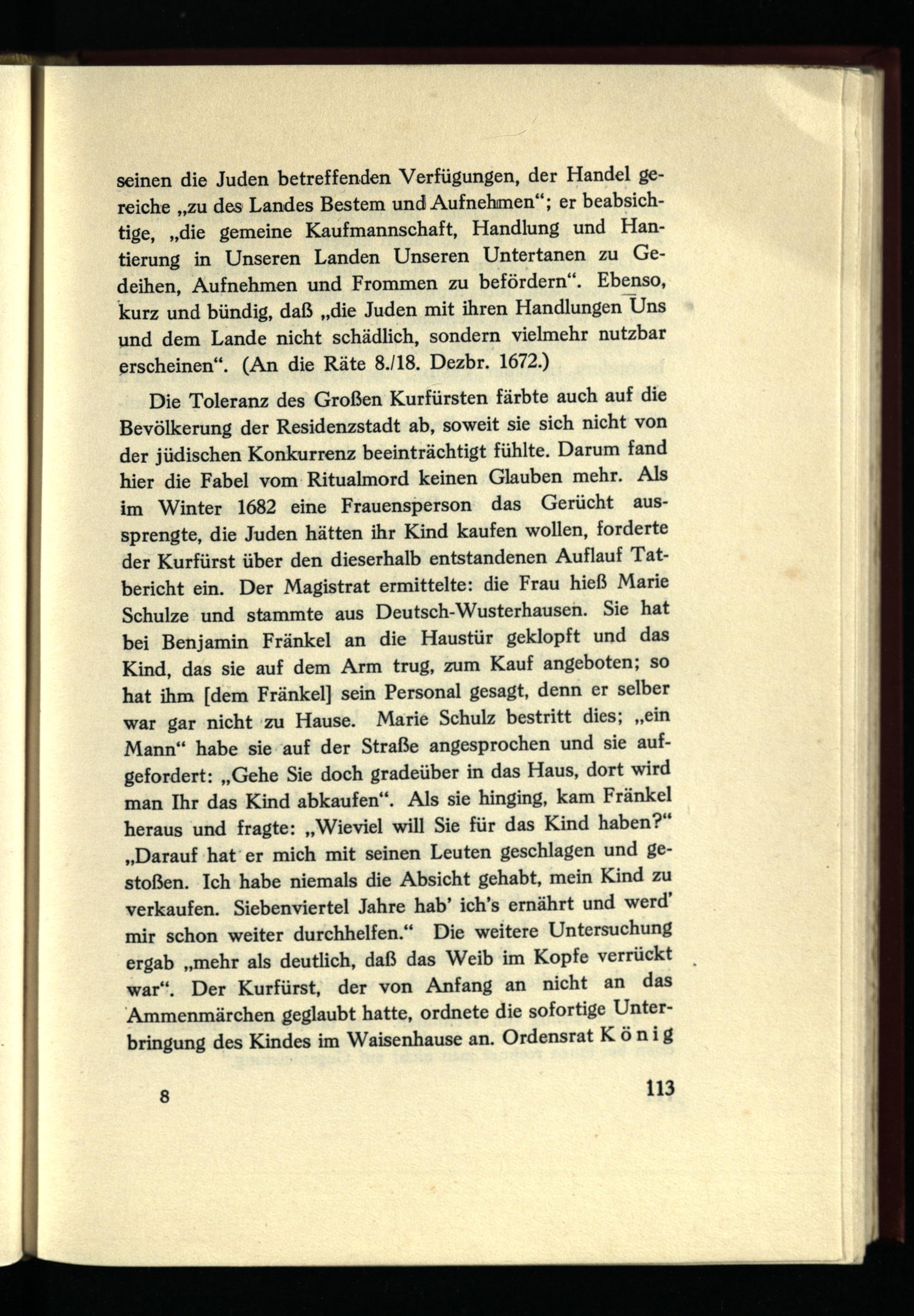 Die Toleranz des Großen Kurfürsten färbte auch auf die Bevölkerung der Residenzstadt ab, soweit sie sich nicht von der jüdischen Konkurrenz beeinträchtigt fühlte. Darum fand hier die Fabel vom Ritualmord keinen Glauben mehr. Als im Winter 1682 eine Frauensperson das Gerücht aussprengte, die Juden hätten ihr Kind kaufen wollen, forderte der Kurfürst über den dieserhalb entstandenen Auflauf Tatbericht ein. Der Magistrat ermittelte: die Frau hieß Marie Schulze und stammte aus Deutsch-Wusterhausen. Sie hat bei Benjamin Fränkel an die Haustür geklopft und das Kind, das sie auf dem Arm trug, zum Kauf angeboten; so hat ihm [dem Fränkel] sein Personal gesagt, denn er selber war gar nicht zu Hause. Marie Schulz bestritt dies; „ein Mann“ habe sie auf der Straße angesprochen und sie aufgefordert: „Gehe Sie doch gradeüber in das Haus, dort wird man Ihr das Kind abkaufen“. Als sie hinging, kam Fränkel heraus und fragte: „Wieviel will Sie für das Kind haben?“ „Darauf hat er mich mit seinen Leuten geschlagen und gestoßen. Ich habe niemals die Absicht gehabt, mein Kind zu verkaufen. Siebenviertel Jahre hab’ ich’s ernährt und werd’ mir schon weiter durchhelfen.“ Die weitere Untersuchung ergab „mehr als deutlich, daß das Weib im Kopfe verrückt war“. Der Kurfürst, der von Anfang an nicht an das Ammenmärchen geglaubt hatte, ordnete die sofortige Unterbringung des Kindes im Waisenhause an. Ordensrat König