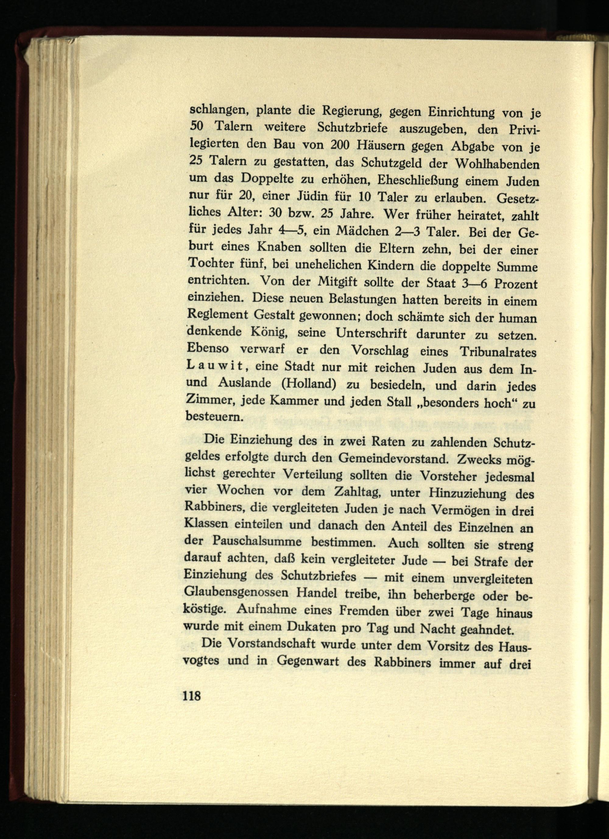 schlangen, plante die Regierung, gegen Einrichtung von je 50 Talern weitere Schutzbriefe auszugeben, den Privilegierten den Bau von 200 Häusern gegen Abgabe von je 25 Talern zu gestatten, das Schutzgeld der Wohlhabenden um das Doppelte zu erhöhen, Eheschließung einem Juden nur für 20, einer Jüdin für 10 Taler zu erlauben. Gesetzliches Alter: 30 bzw. 25 Jahre. Wer früher heiratet, zahlt für jedes Jahr 4—5, ein Mädchen 2—3 Taler. Bei der Geburt eines Knaben sollten die Eltern zehn, bei der einer Tochter fünf, bei unehelichen Kindern die doppelte Summe entrichten. Von der Mitgift sollte der Staat 3—6 Prozent einziehen. Diese neuen Belastungen hatten bereits in einem Reglement Gestalt gewonnen; doch schämte sich der human denkende König, seine Unterschrift darunter zu setzen. Ebenso verwarf er den Vorschlag eines Tribunalrates Lauwit, eine Stadt nur mit reichen Juden aus dem In- und Auslande (Holland) zu besiedeln, und darin jedes Zimmer, jede Kammer und jeden Stall „besonders hoch“ zu besteuern.