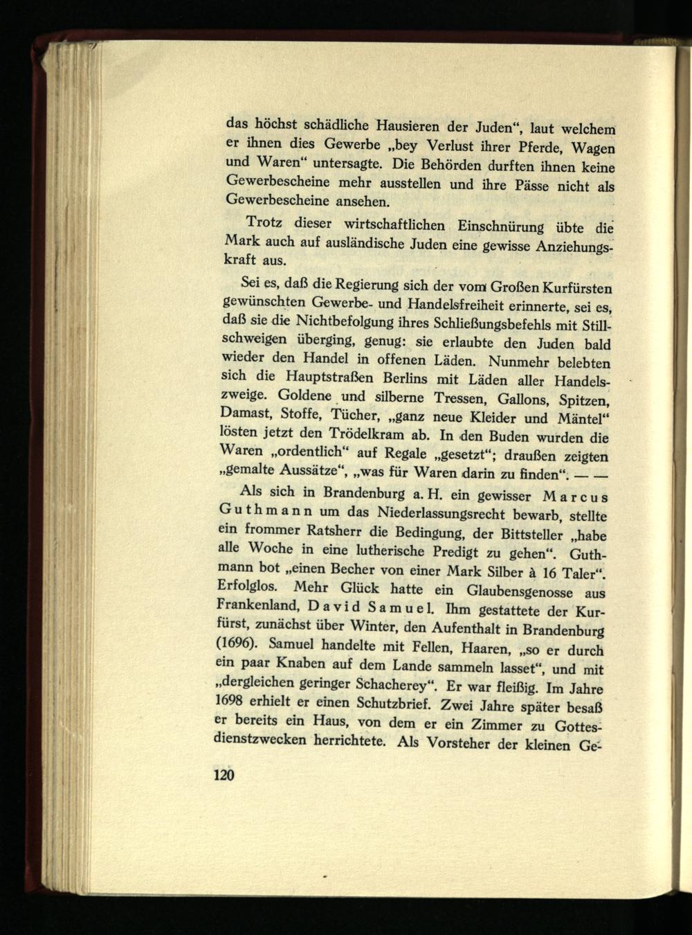 Als sich in Brandenburg a. H. ein gewisser Marcus Guthmann um das Niederlassungsrecht bewarb, stellte ein frommer Ratsherr die Bedingung, der Bittsteller „habe alle Woche in eine lutherische Predigt zu gehen“. Guthmann bot „einen Becher von einer Mark Silber à 16 Taler“. Erfolglos. Mehr Glück hatte ein Glaubensgenosse aus Frankenland, David Samuel. Ihm gestattete der Kurfürst, zunächst über Winter, den Aufenthalt in Brandenburg (1696). Samuel handelte mit Fellen, Haaren, „so er durch ein paar Knaben auf dem Lande sammeln lasset“, und mit „dergleichen geringer Schacherey“. Er war fleißig. Im Jahre 1698 erhielt er einen Schutzbrief. Zwei Jahre später besaß er bereits ein Haus, von dem er ein Zimmer zu Gottesdienstzwecken herrichtete. Als Vorsteher der kleinen Ge-