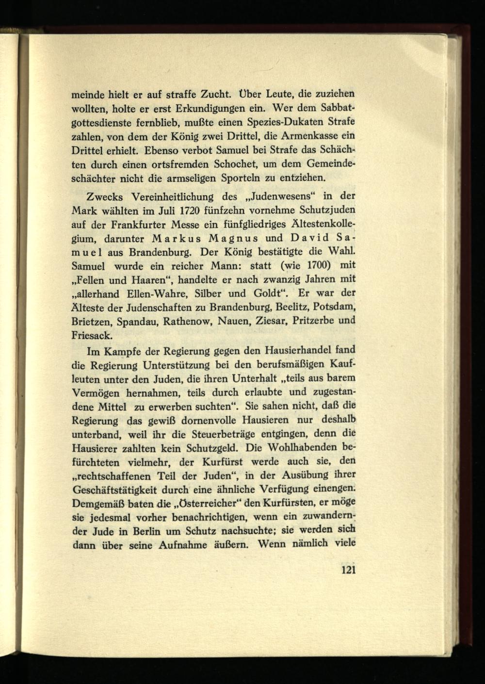 meinde hielt er auf straffe Zucht. Über Leute, die zuziehen wollten, holte er erst Erkundigungen ein. Wer dem Sabbatgottesdienste fernblieb, mußte einen Spezies-Dukaten Strafe zahlen, von dem der König zwei Drittel, die Armenkasse ein Drittel erhielt. Ebenso verbot Samuel bei Strafe das Schächten durch einen ortsfremden Schochet, um dem Gemeindeschächter nicht die armseligen Sporteln zu entziehen.