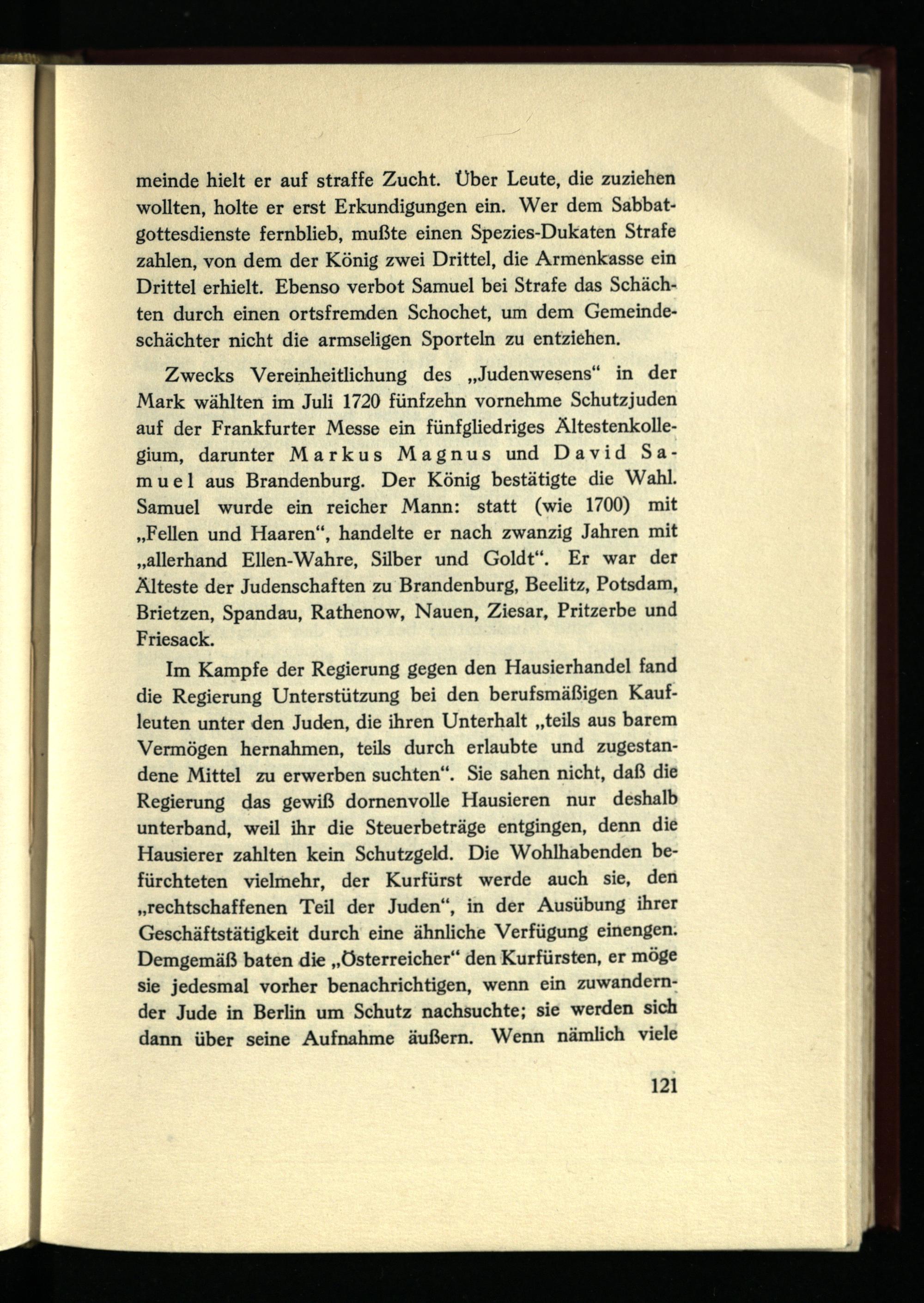 Zwecks Vereinheitlichung des „Judenwesens“ in der Mark wählten im Juli 1720 fünfzehn vornehme Schutzjuden auf der Frankfurter Messe ein fünfgliedriges Ältestenkollegium, darunter Markus Magnus und David Samuel aus Brandenburg. Der König bestätigte die Wahl. Samuel wurde ein reicher Mann: statt (wie 1700) mit „Fellen und Haaren“, handelte er nach zwanzig Jahren mit „allerhand Ellen-Wahre, Silber und Goldt“. Er war der Älteste der Judenschaften zu Brandenburg, Beelitz, Potsdam, Brietzen, Spandau, Rathenow, Nauen, Ziesar, Pritzerbe und Friesack.