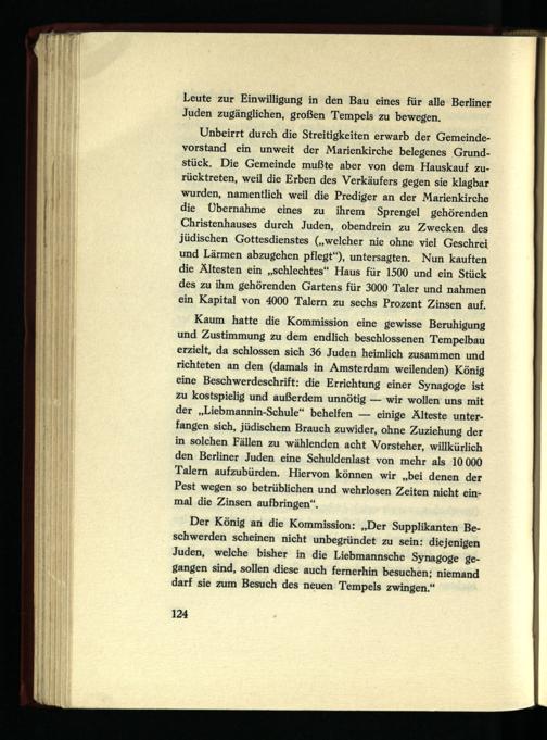 Kaum hatte die Kommission eine gewisse Beruhigung und Zustimmung zu dem endlich beschlossenen Tempelbau erzielt, da schlossen sich 36 Juden heimlich zusammen und richteten an den (damals in Amsterdam weilenden) König eine Beschwerdeschrift: die Errichtung einer Synagoge ist zu kostspielig und außerdem unnötig — wir wollen uns mit der „Liebmannin-Schule“ behelfen — einige Älteste unterfangen sich, jüdischem Brauch zuwider, ohne Zuziehung der in solchen Fällen zu wählenden acht Vorsteher, willkürlich den Berliner Juden eine Schuldenlast von mehr als 10000 Talern aufzubürden. Hiervon können wir „bei denen der Pest wegen so betrüblichen und wehrlosen Zeiten nicht einmal die Zinsen aufbringen“.