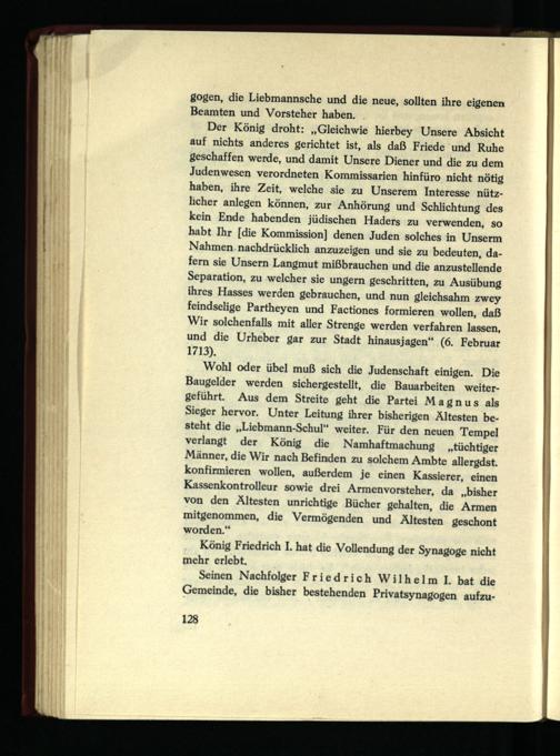 Wohl oder übel muß sich die Judenschaft einigen. Die Baugelder werden sichergestellt, die Bauarbeiten weitergeführt. Aus dem Streite geht die Partei Magnus als Sieger hervor. Unter Leitung ihrer bisherigen Ältesten besteht die „Liebmann-Schul“ weiter. Für den neuen Tempel verlangt der König die Namhaftmachung „tüchtiger Männer, die Wir nach Befinden zu solchem Ambte allergdst. konfirmieren wollen, außerdem je einen Kassierer, einen Kassenkontrolleur sowie drei Armenvorsteher, da „bisher von den Ältesten unrichtige Bücher gehalten, die Armen mitgenommen, die Vermögenden und Ältesten geschont worden.“