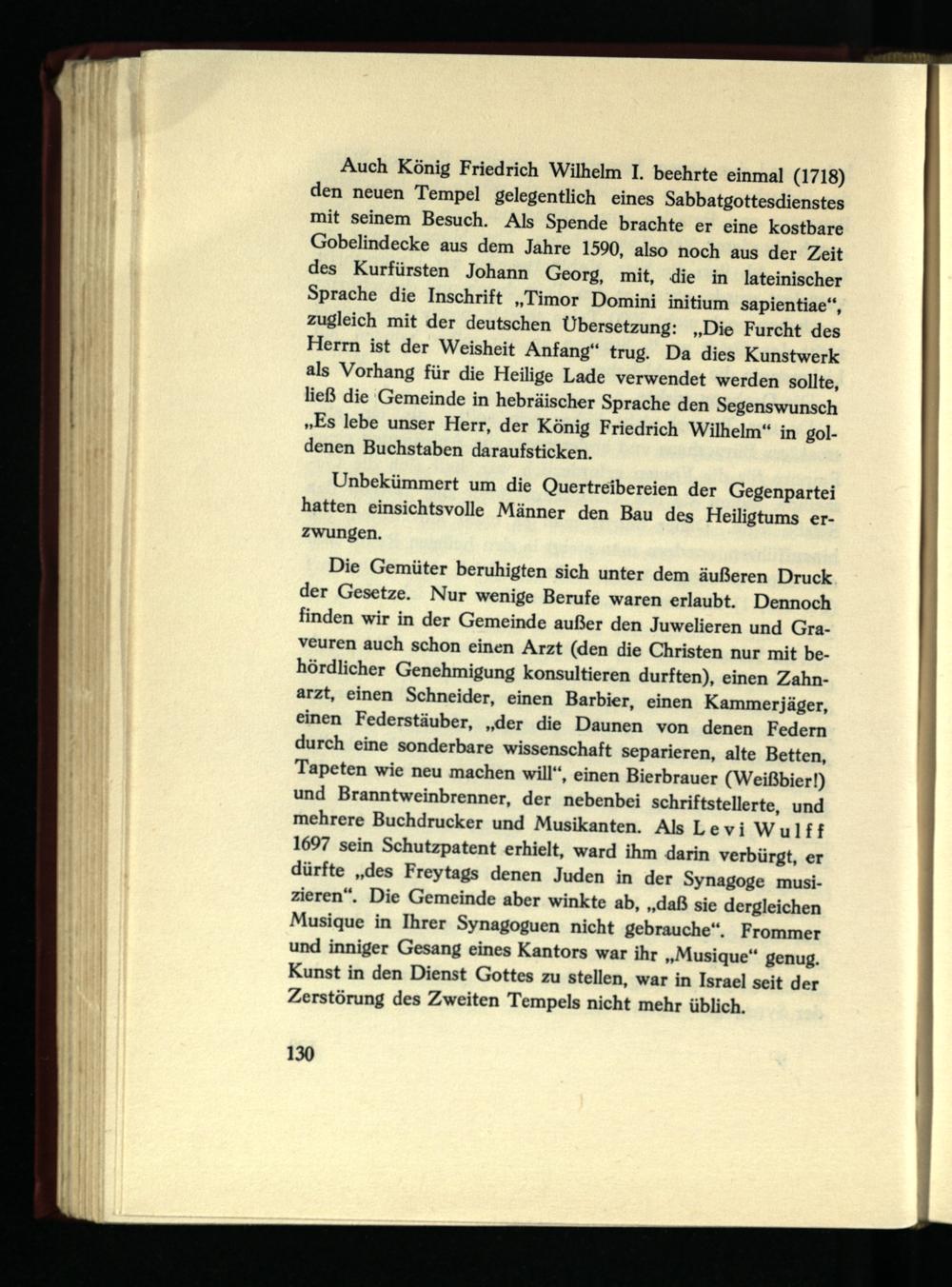 Die Gemüter beruhigten sich unter dem äußeren Druck der Gesetze. Nur wenige Berufe waren erlaubt. Dennoch finden wir in der Gemeinde außer den Juwelieren und Graveuren auch schon einen Arzt (den die Christen nur mit behördlicher Genehmigung konsultieren durften), einen Zahnarzt, einen Schneider, einen Barbier, einen Kammerjäger, einen Federstäuber, „der die Daunen von denen Federn durch eine sonderbare Wissenschaft separieren, alte Betten, Tapeten wie neu machen will“, einen Bierbrauer (Weißbier!) und Branntweinbrenner, der nebenbei schriftstellerte, und mehrere Buchdrucker und Musikanten. Als L e v i Wulff 1697 sein Schutzpatent erhielt, ward ihm darin verbürgt, er dürfte „des Freytags denen Juden in der Synagoge musizieren". Die Gemeinde aber winkte ab, „daß sie dergleichen Musique in Ihrer Synagoguen nicht gebrauche“. Frommer und inniger Gesang eines Kantors war ihr „Musique“ genug. Kunst in den Dienst Gottes zu stellen, war in Israel seit der Zerstörung des Zweiten Tempels nicht mehr üblich.