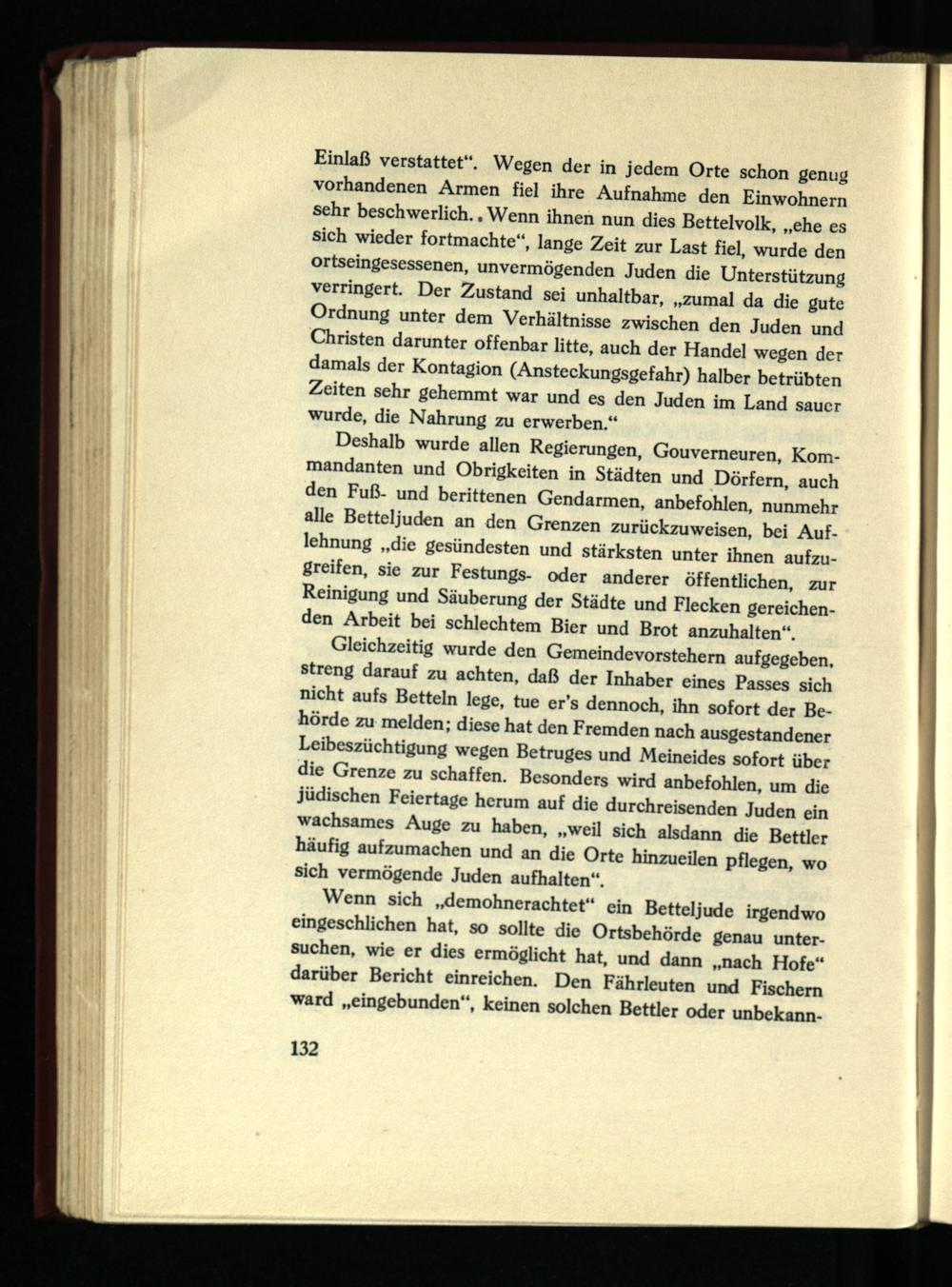 Gleichzeitig wurde den Gemeindevorstehern aufgegeben, streng darauf zu achten, daß der Inhaber eines Passes sich nicht aufs Betteln lege, tue er’s dennoch, ihn sofort der Behörde zu melden; diese hat den Fremden nach ausgestandener Leibeszüchtigung wegen Betruges und Meineides sofort über die Grenze zu schaffen. Besonders wird anbefohlen, um die jüdischen Feiertage herum auf die durchreisenden Juden ein wachsames Auge zu haben, „weil sich alsdann die Bettler häufig aufzumachen und an die Orte hinzueilen pflegen, wo sich vermögende Juden aufhalten“.