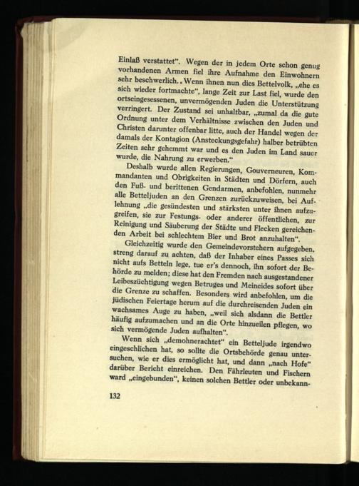 Deshalb wurde allen Regierungen, Gouverneuren, Kommandanten und Obrigkeiten in Städten und Dörfern, auch den Fuß- und berittenen Gendarmen, anbefohlen, nunmehr alle Betteljuden an den Grenzen zurückzuweisen, bei Auflehnung „die gesündesten und stärksten unter ihnen aufzugreifen, sie zur Festungs- oder anderer öffentlichen, zur Reinigung und Säuberung der Städte und Flecken gereichenden Arbeit bei schlechtem Bier und Brot anzuhalten“.