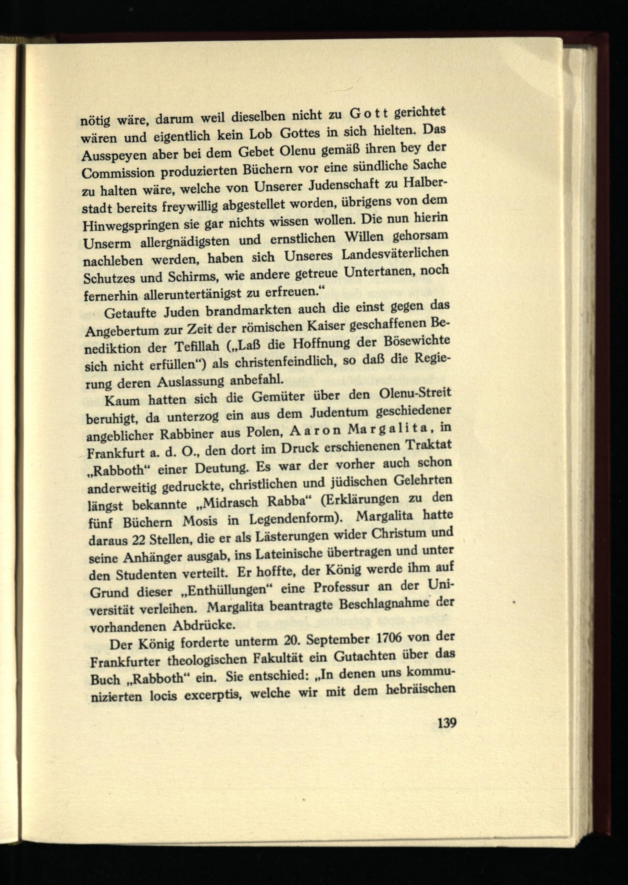 Kaum hatten sich die Gemüter über den Olenu-Streit beruhigt, da unterzog ein aus dem Judentum geschiedener angeblicher Rabbiner aus Polen, Aaron Margalita, in Frankfurt a. d. O., den dort im Druck erschienenen Traktat „Rabboth“ einer Deutung. Es war der vorher auch schon anderweitig gedruckte, christlichen und jüdischen Gelehrten längst bekannte „Midrasch Rabba“ (Erklärungen zu den fünf Büchern Mosis in Legendenform). Margalita hatte daraus 22 Stellen, die er als Lästerungen wider Christum und seine Anhänger ausgab, ins Lateinische übertragen und unter den Studenten verteilt. Er hoffte, der König werde ihm auf Grund dieser „Enthüllungen“ eine Professur an der Universität verleihen. Margalita beantragte Beschlagnahme der vorhandenen Abdrücke.
