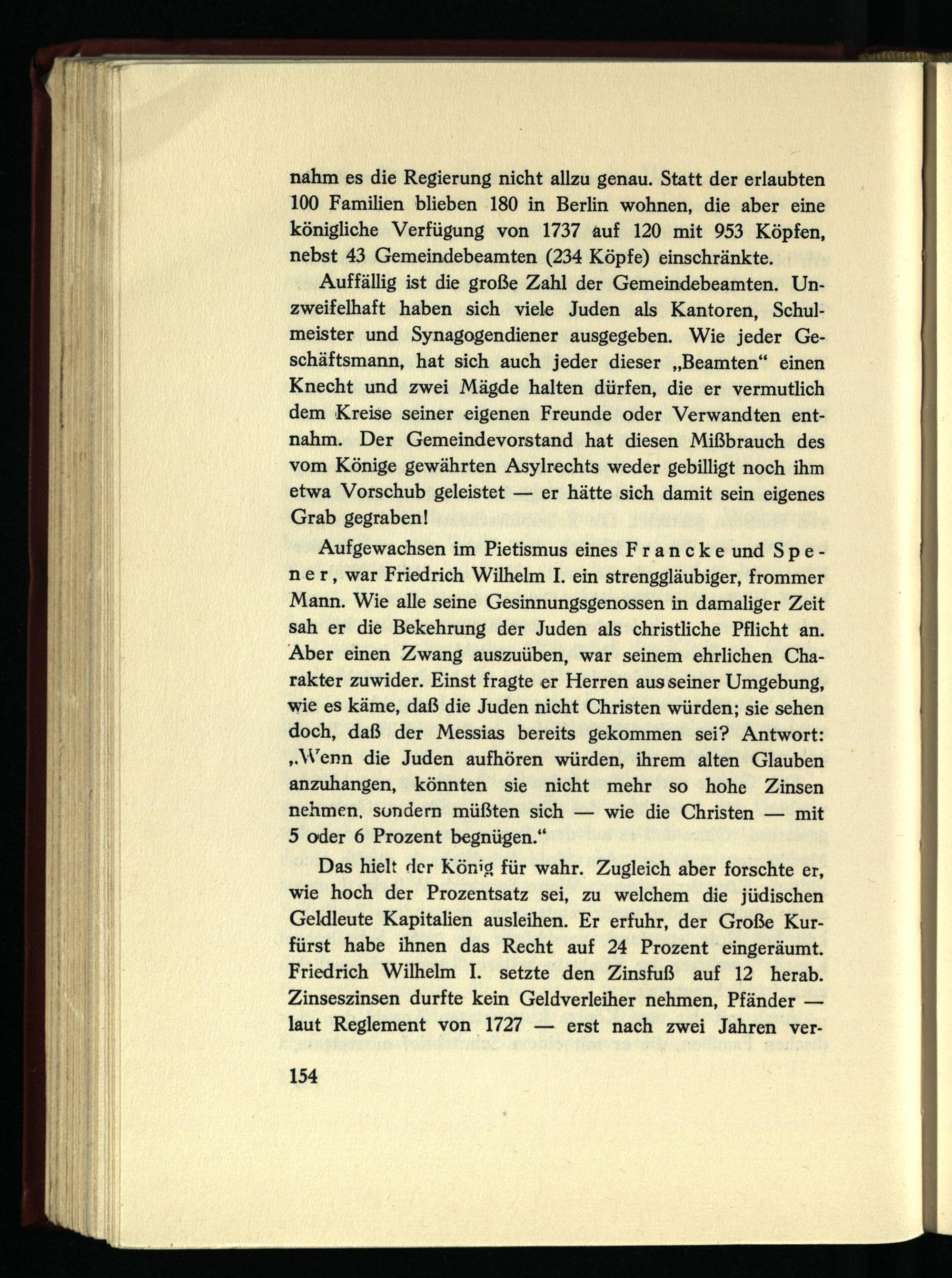Aufgewachsen im Pietismus eines F r a n c k e und S p e - ner, war Friedrich Wilhelm I. ein strenggläubiger, frommer Mann. Wie alle seine Gesinnungsgenossen in damaliger Zeit sah er die Bekehrung der Juden als christliche Pflicht an. Aber einen Zwang auszuüben, war seinem ehrlichen Charakter zuwider. Einst fragte er Herren aus seiner Umgebung, wie es käme, daß die Juden nicht Christen würden; sie sehen doch, daß der Messias bereits gekommen sei? Antwort: „Wenn die Juden aufhören würden, ihrem alten Glauben anzuhangen, könnten sie nicht mehr so hohe Zinsen nehmen, sondern müßten sich — wie die Christen — mit 5 oder 6 Prozent begnügen.“