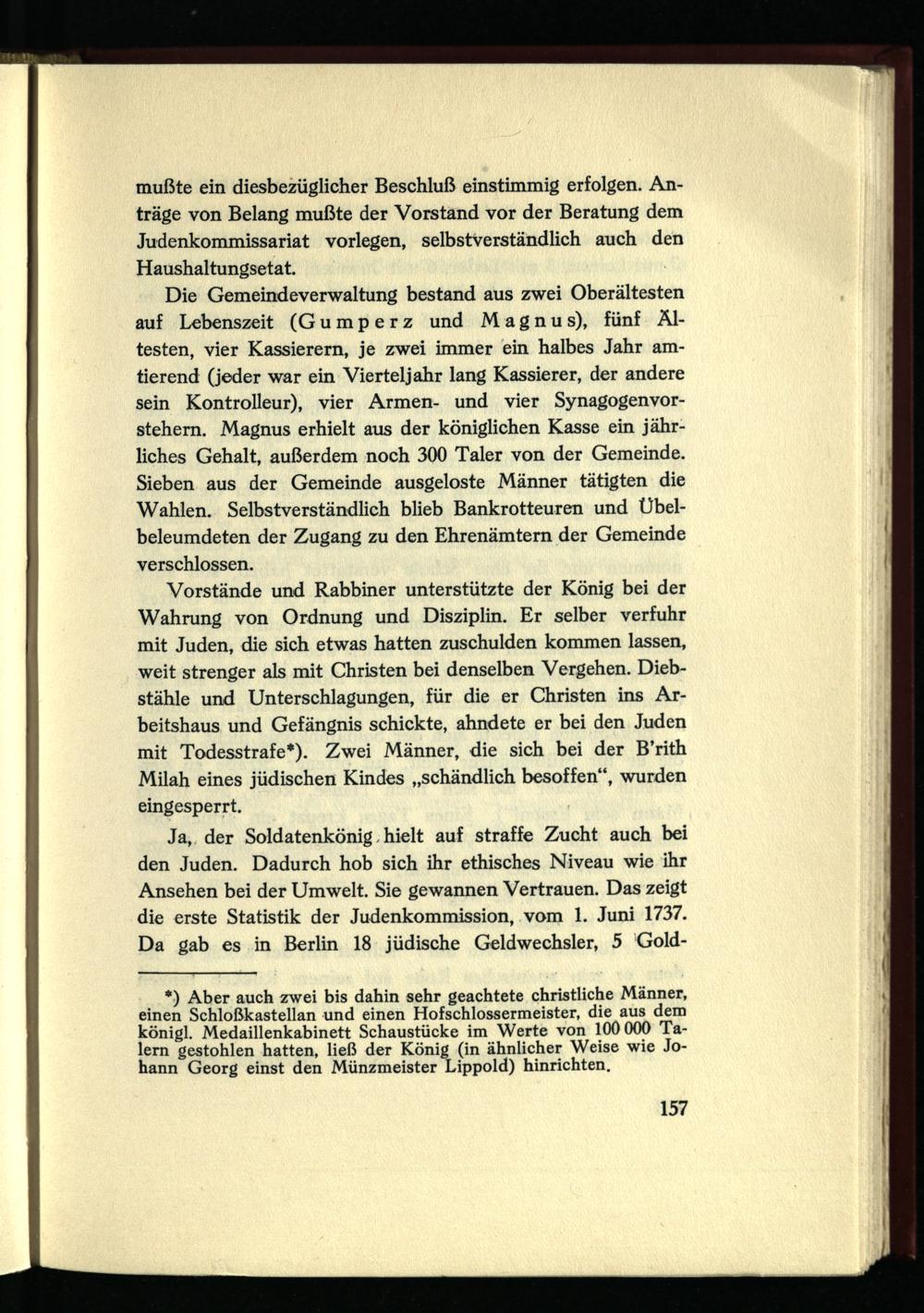 Die Gemeindeverwaltung bestand aus zwei Oberältesten auf Lebenszeit (Gumperz und Magnus ), fünf Ältesten, vier Kassierern, je zwei immer ein halbes Jahr amtierend (jeder war ein Vierteljahr lang Kassierer, der andere sein Kontrolleur), vier Armen- und vier Synagogenvor- stehern. Magnus erhielt aus der königlichen Kasse ein jährliches Gehalt, außerdem noch 300 Taler von der Gemeinde. Sieben aus der Gemeinde ausgeloste Männer tätigten die Wahlen. Selbstverständlich blieb Bankrotteuren und Übel- beleumdeten der Zugang zu den Ehrenämtern der Gemeinde verschlossen.
