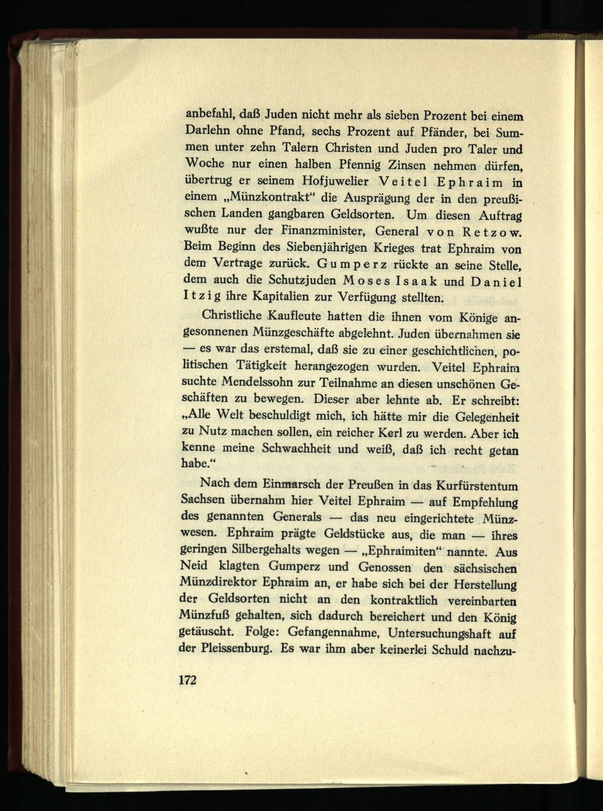 anbefahl, daß Juden nicht mehr als sieben Prozent bei einem Darlehn ohne Pfand, sechs Prozent auf Pfänder, bei Summen unter zehn Talern Christen und Juden pro Taler und Woche nur einen halben Pfennig Zinsen nehmen dürfen, übertrug er seinem Hofjuwelier Veitei Ephraim in einem „Münzkontrakt“ die Ausprägung der in den preußischen Landen gangbaren Geldsorten. Um diesen Auftrag wußte nur der Finanzminister, General von Retzow. Beim Beginn des Siebenjährigen Krieges trat Ephraim von dem Vertrage zurück. Gumperz rückte an seine Stelle, dem auch die Schutzjuden Moses Isaak und Daniel Itzig ihre Kapitalien zur Verfügung stellten.