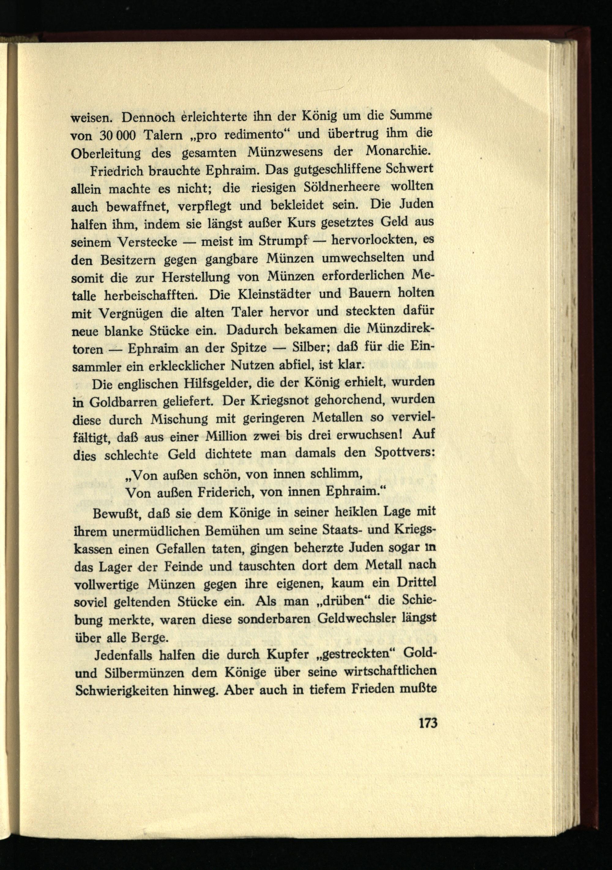 Friedrich brauchte Ephraim. Das gutgeschliffene Schwert allein machte es nicht; die riesigen Söldnerheere wollten auch bewaffnet, verpflegt und bekleidet sein. Die Juden halfen ihm, indem sie längst außer Kurs gesetztes Geld aus seinem Verstecke — meist im Strumpf — hervorlockten, es den Besitzern gegen gangbare Münzen umwechselten und somit die zur Herstellung von Münzen erforderlichen Metalle herbeischafften. Die Kleinstädter und Bauern holten mit Vergnügen die alten Taler hervor und steckten dafür neue blanke Stücke ein. Dadurch bekamen die Münzdirektoren — Ephraim an der Spitze — Silber; daß für die Einsammler ein erklecklicher Nutzen abfiel, ist klar.