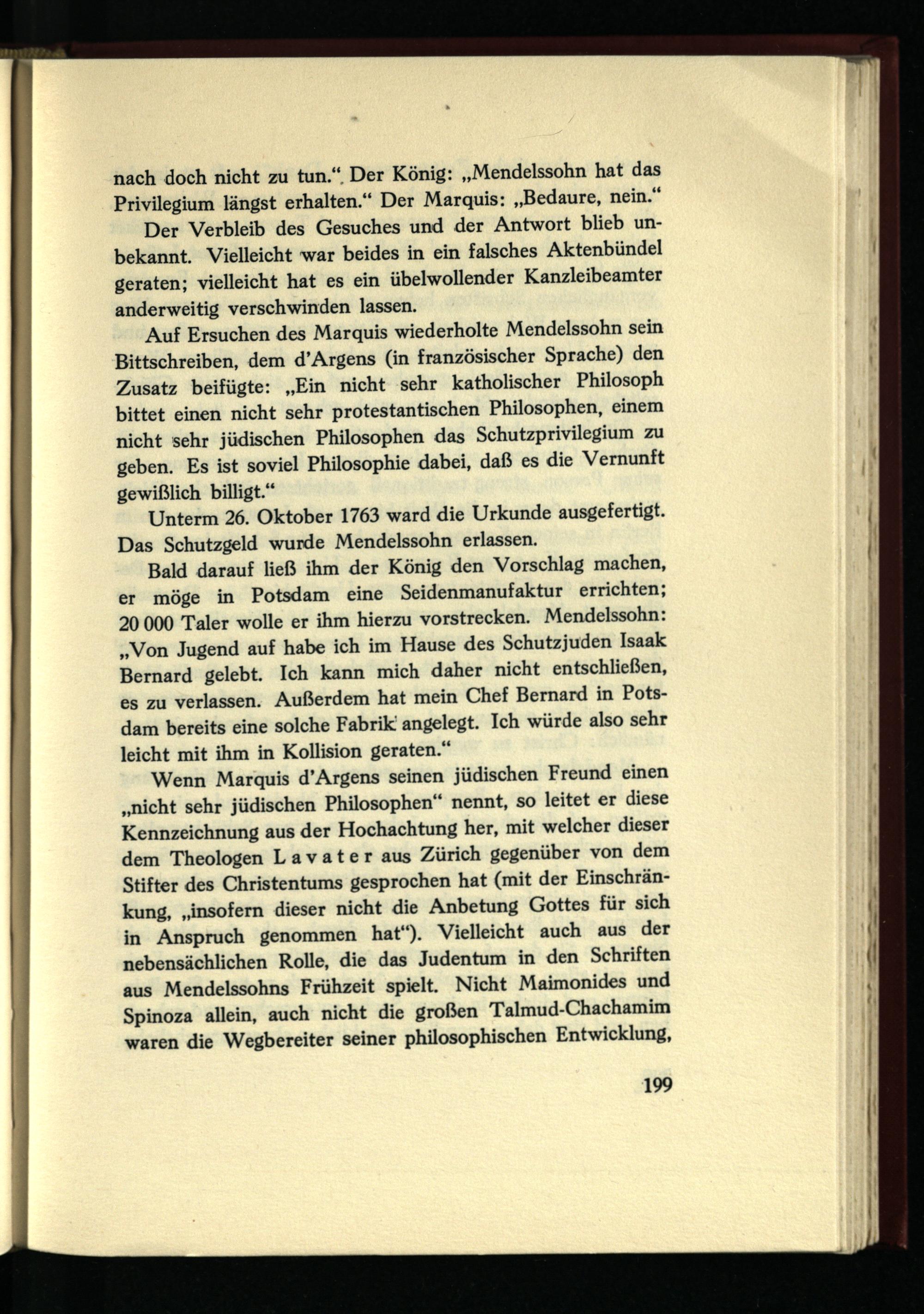 nach doch nicht zu tun.“ Der König: „Mendelssohn hat das Privilegium längst erhalten.“ Der Marquis: „Bedaure, nein.“