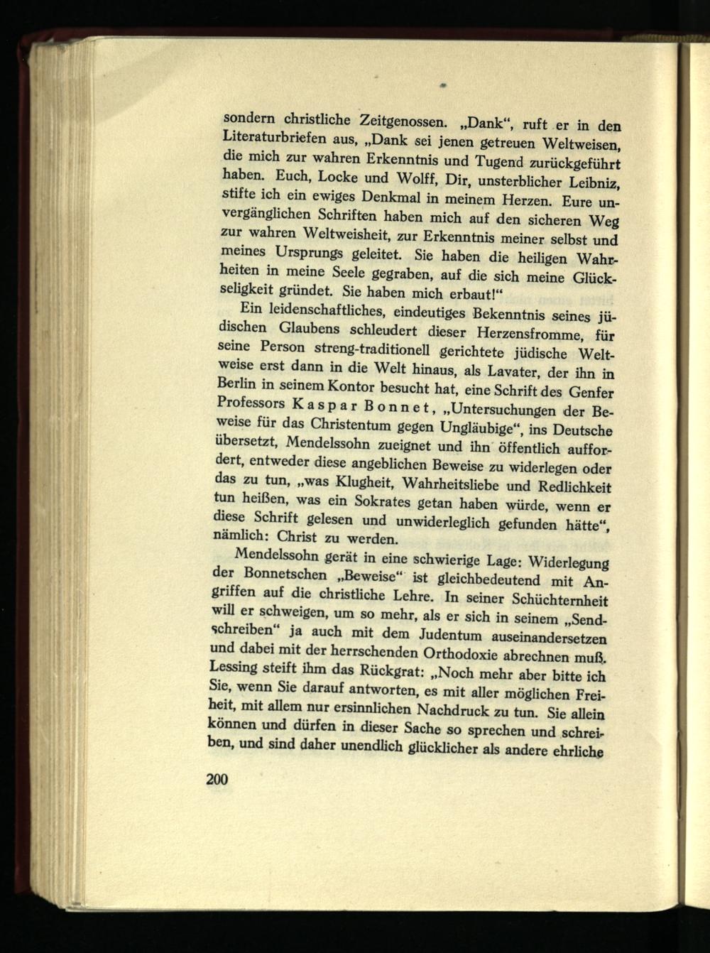 Ein leidenschaftliches, eindeutiges Bekenntnis seines jüdischen Glaubens schleudert dieser Herzensfromme, für seine Person streng-traditionell gerichtete jüdische Weltweise erst dann in die Welt hinaus, als Lavater, der ihn in Berlin in seinem Kontor besucht hat, eine Schrift des Genfer Professors Kaspar Bonnet, „Untersuchungen der Beweise für das Christentum gegen Ungläubige“, ins Deutsche übersetzt, Mendelssohn zueignet und ihn öffentlich auffordert, entweder diese angeblichen Beweise zu widerlegen oder das zu tun, „was Klugheit, Wahrheitsliebe und Redlichkeit tun heißen, was ein Sokrates getan haben würde, wenn er diese Schrift gelesen und unwiderleglich gefunden hätte“, nämlich: Christ zu werden.