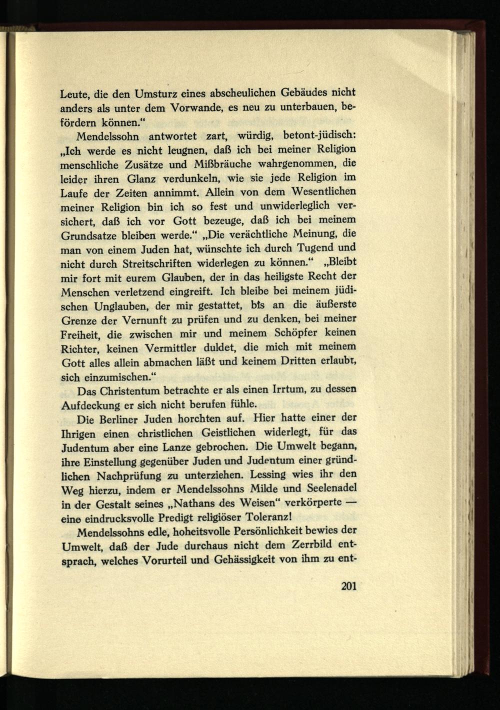 Die Berliner Juden horchten auf. Hier hatte einer der Ihrigen einen christlichen Geistlichen widerlegt, für das Judentum aber eine Lanze gebrochen. Die Umwelt begann, ihre Einstellung gegenüber Juden und Judentum einer gründlichen Nachprüfung zu unterziehen. Lessing wies ihr den Weg hierzu, indem er Mendelssohns Milde und Seelenadel in der Gestalt seines „Nathans des Weisen“ verkörperte — eine eindrucksvolle Predigt religiöser Toleranz!