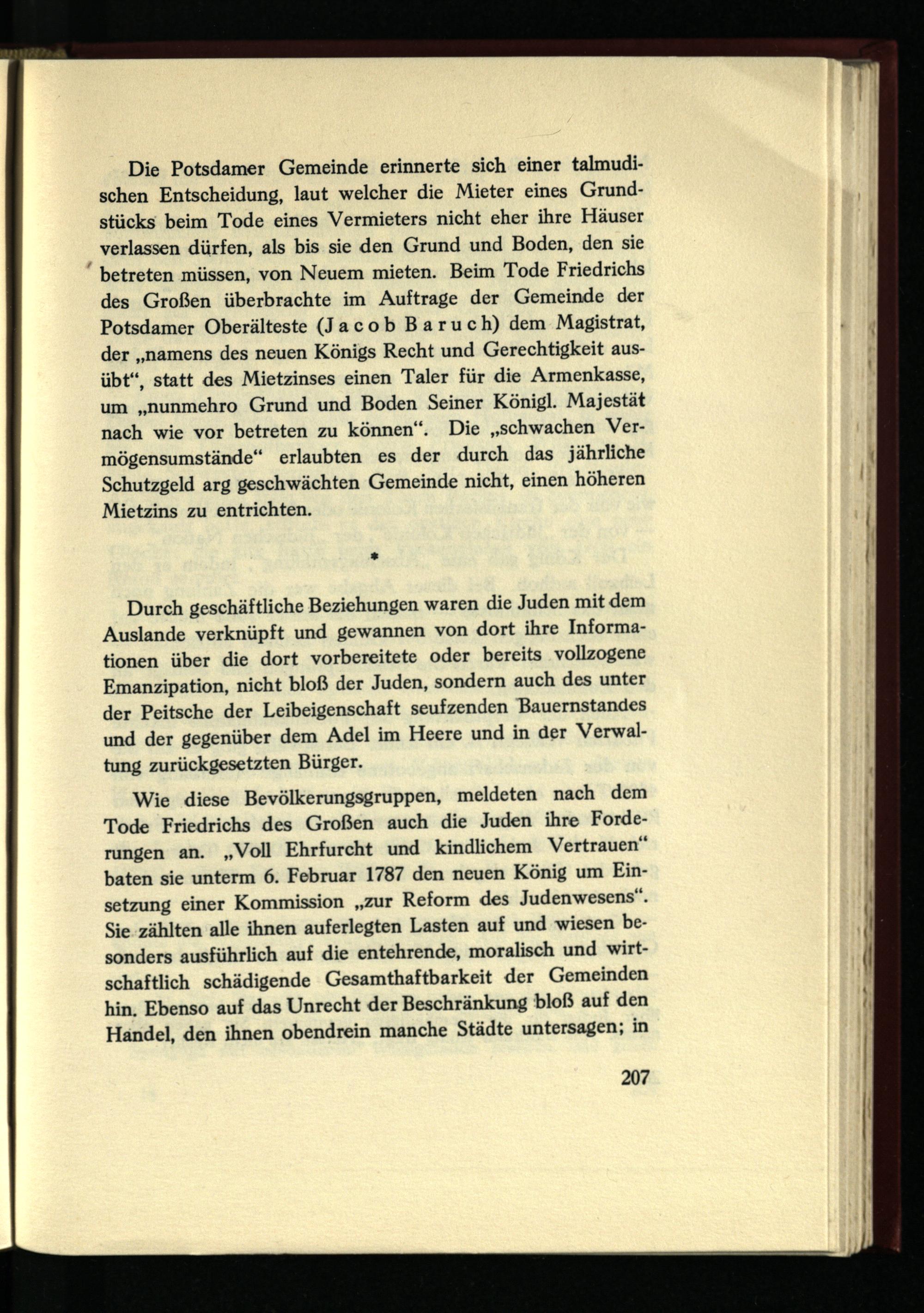 Wie diese Bevölkerungsgruppen, meldeten nach dem Tode Friedrichs des Großen auch die Juden ihre Forderungen an. „Voll Ehrfurcht und kindlichem Vertrauen“ baten sie unterm 6. Februar 1787 den neuen König um Einsetzung einer Kommission „zur Reform des Judenwesens“. Sie zählten alle ihnen auferlegten Lasten auf und wiesen besonders ausführlich auf die entehrende, moralisch und wirtschaftlich schädigende Gesamthaftbarkeit der Gemeinden hin. Ebenso auf das Unrecht der Beschränkung bloß auf den Handel, den ihnen obendrein manche Städte untersagen; in