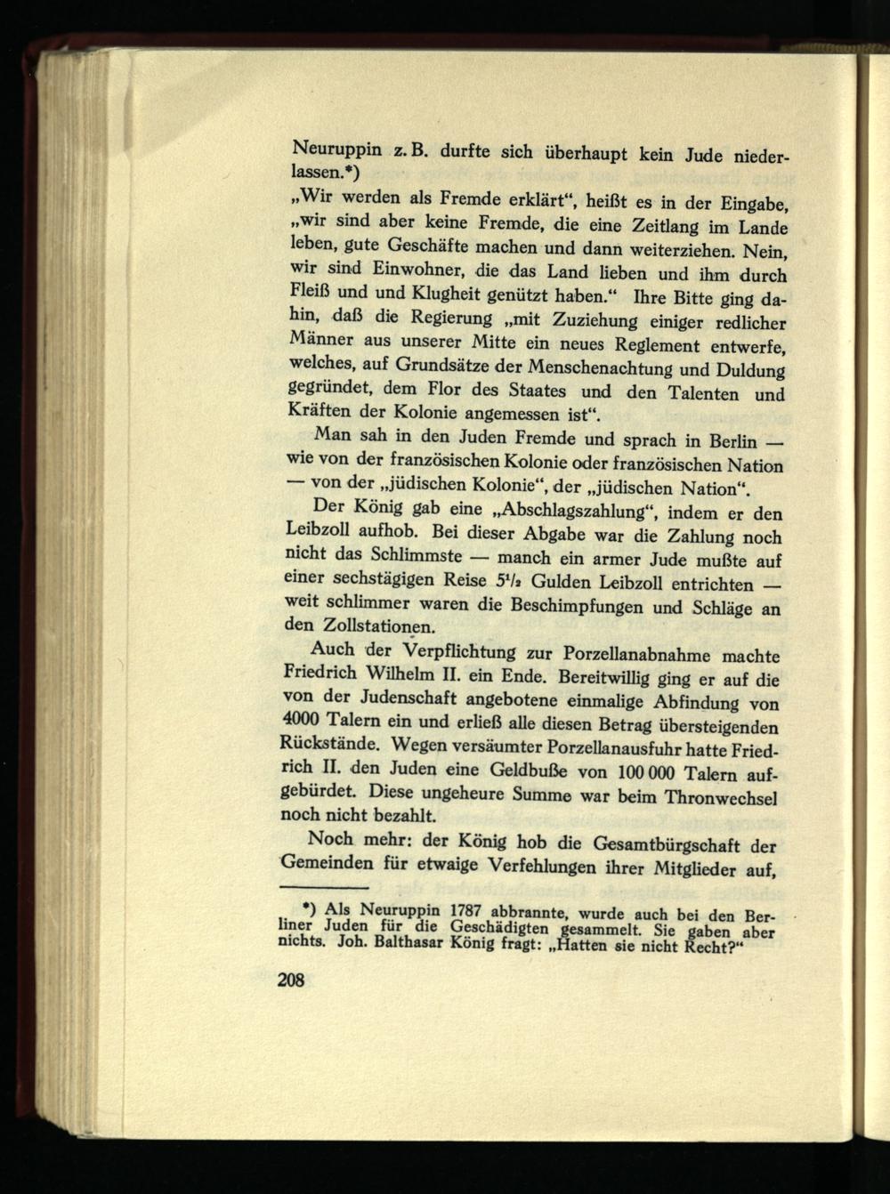 *) Als Neuruppin 1787 abbrannte, wurde auch bei den Berliner Juden für die Geschädigten gesammelt. Sie gaben aber nichts. Joh. Balthasar König fragt: „Hatten sie nicht Recht?“