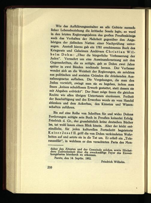 Wie das Aufklärungszeitalter an alle Gebiete menschlicher Lebensbeziehung die kritische Sonde legte, so ward in den letzten Regierungsjahren des großen Preußenkönigs auch das Verhalten der Mehrheit gegenüber den Angehörigen der jüdischen Nation einer Nachprüfung unterzogen. Anstoß hierzu gab ein 1781 erschienenes Buch des Kriegsrats und Geheimen Archivars Christian Wilhelm Dohm: „Über die bürgerliche Verbesserung der Juden“. Vermehrt um eine Auseinandersetzung mit den Gegenschriften, die es zeitigte, gab es Dohm zwei Jahre später in zwei Bänden nochmals heraus. Der Verfasser wendet sich an die Weisheit der Regierungen, sie möchten aus politischen und sozialen Gründen die drückenden Ausnahmegesetze aufheben. Die Vergehungen, die man den Juden vorwirft, zwingt man sie zu begehen, indem man ihnen „keinen schuldlosen Erwerb gestattet, statt dessen sie mit Abgaben erdrückt“. Der Staat möge ihnen die gleichen Rechte wie allen übrigen Untertanen einräumen. Freiheit der Beschäftigung und des Erwerbes werde sie vom Handel ablenken und dem Ackerbau, den Künsten und Wissenschaften zuführen.