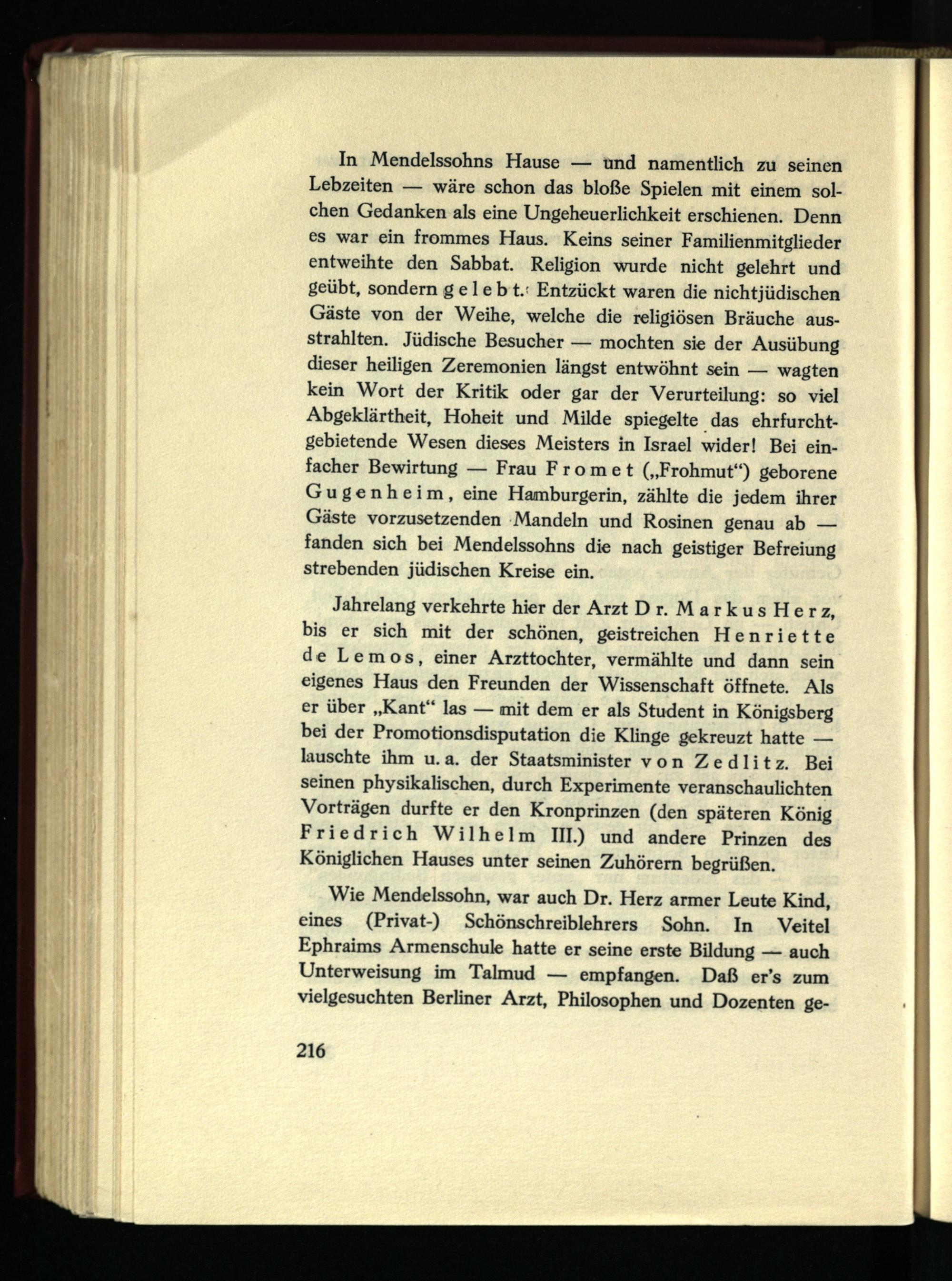 Wie Mendelssohn, war auch Dr. Herz armer Leute Kind, eines (Privat-) Schönschreiblehrers Sohn. In Veitei Ephraims Armenschule hatte er seine erste Bildung — auch Unterweisung im Talmud — empfangen. Daß er’s zum vielgesuchten Berliner Arzt, Philosophen und Dozenten ge-