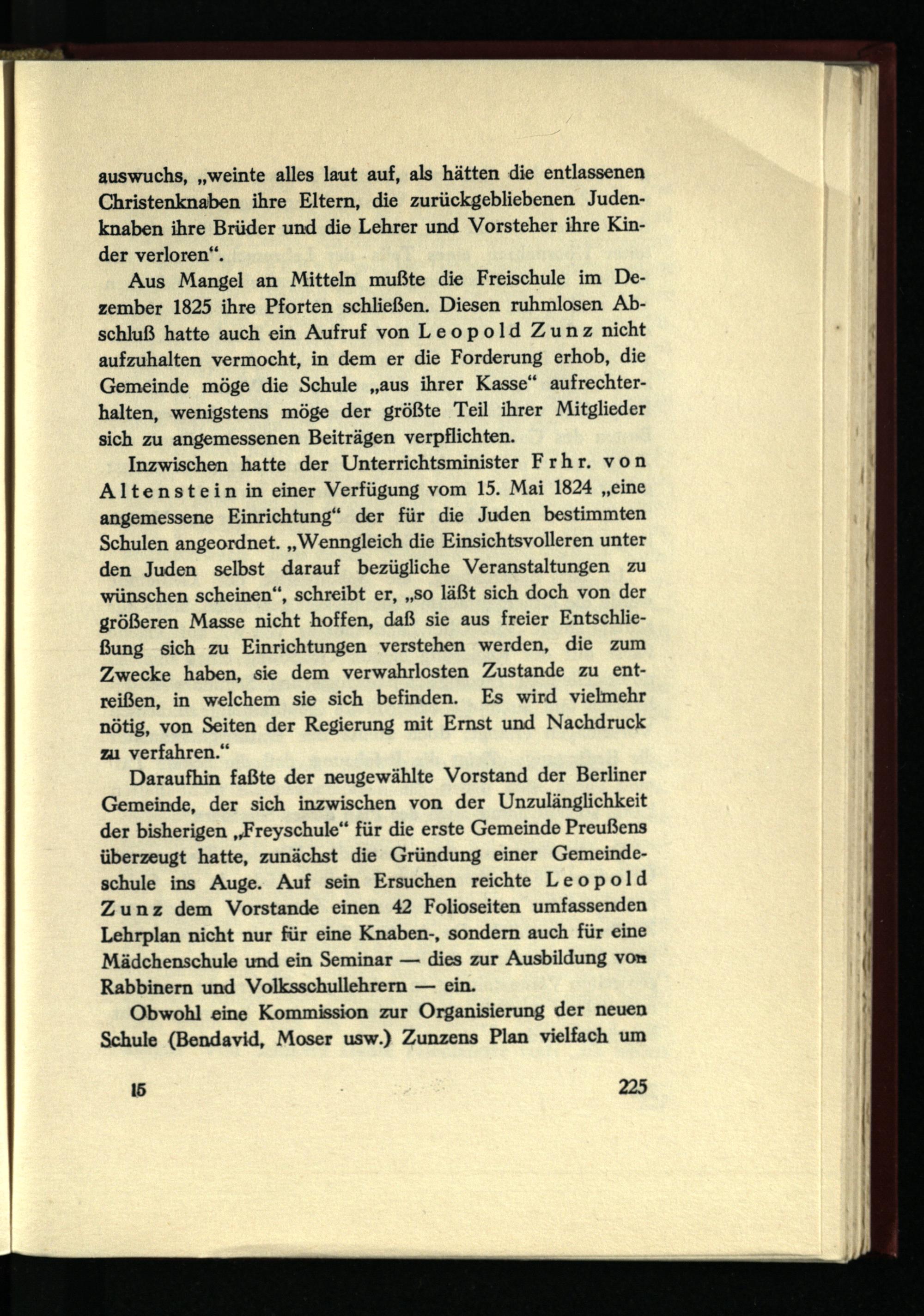 Inzwischen hatte der Unterrichtsminister Frhr. von Altenstein in einer Verfügung vom 15. Mai 1824 „eine angemessene Einrichtung“ der für die Juden bestimmten Schulen angeordnet. „Wenngleich die Einsichtsvolleren unter den Juden selbst darauf bezügliche Veranstaltungen zu wünschen scheinen“, schreibt er, „so läßt sich doch von der größeren Masse nicht hoffen, daß sie aus freier Entschließung sich zu Einrichtungen verstehen werden, die zum Zwecke haben, sie dem verwahrlosten Zustande zu entreißen, in welchem sie sich befinden. Es wird vielmehr nötig, von Seiten der Regierung mit Ernst und Nachdruck zu verfahren.“