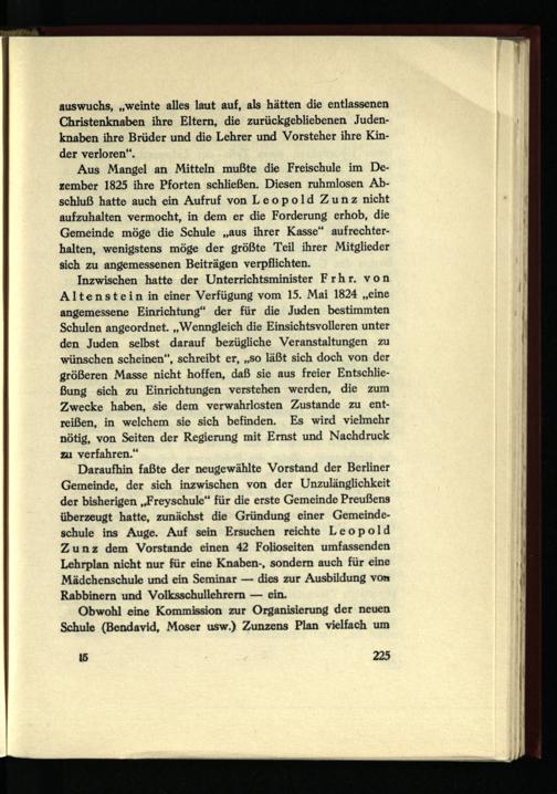 Daraufhin faßte der neugewählte Vorstand der Berliner Gemeinde, der sich inzwischen von der Unzulänglichkeit der bisherigen ,"Freyschule“ für die erste Gemeinde Preußens überzeugt hatte, zunächst die Gründung einer Gemeindeschule ins Auge. Auf sein Ersuchen reichte Leopold Zunz dem Vorstande einen 42 Folioseiten umfassenden Lehrplan nicht nur für eine Knaben-, sondern auch für eine Mädchenschule und ein Seminar — dies zur Ausbildung von Rabbinern und Volksschullehrern — ein.