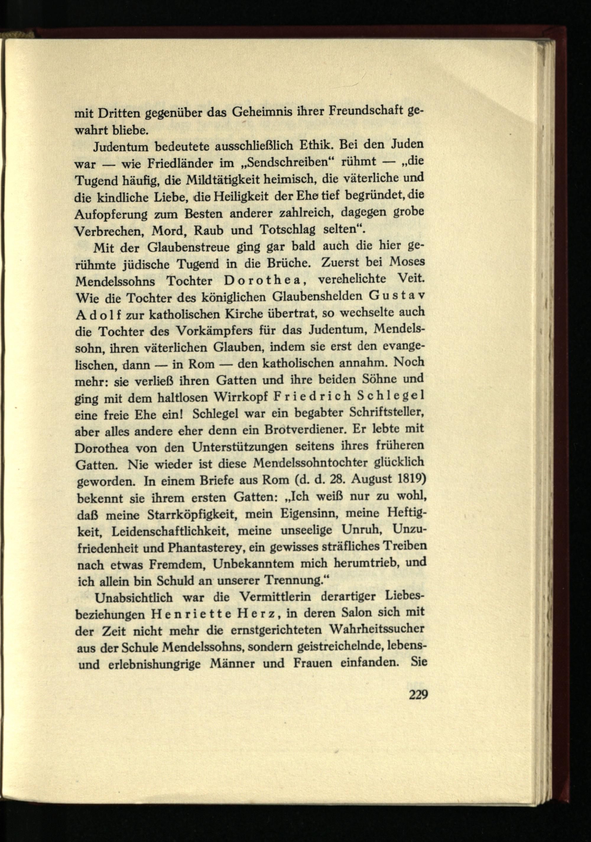 Mit der Glaubenstreue ging gar bald auch die hier gerühmte jüdische Tugend in die Brüche. Zuerst bei Moses Mendelssohns Tochter Dorothea, verehelichte Veit. Wie die Tochter des königlichen Glaubenshelden Gustav Adolf zur katholischen Kirche übertrat, so wechselte auch die Tochter des Vorkämpfers für das Judentum, Mendelssohn, ihren väterlichen Glauben, indem sie erst den evangelischen, dann — in Rom — den katholischen annahm. Noch mehr: sie verließ ihren Gatten und ihre beiden Söhne und ging mit dem haltlosen Wirrkopf Friedrich Schlegel eine freie Ehe ein! Schlegel war ein begabter Schriftsteller, aber alles andere eher denn ein Brotverdiener. Er lebte mit Dorothea von den Unterstützungen seitens ihres früheren Gatten. Nie wieder ist diese Mendelssohntochter glücklich geworden. In einem Briefe aus Rom (d. d. 28. August 1819) bekennt sie ihrem ersten Gatten: „Ich weiß nur zu wohl, daß meine Starrköpfigkeit, mein Eigensinn, meine Heftigkeit, Leidenschaftlichkeit, meine unseelige Unruh, Unzufriedenheit und Phantasterey, ein gewisses sträfliches Treiben nach etwas Fremdem, Unbekanntem mich herumtrieb, und ich allein bin Schuld an unserer Trennung.“