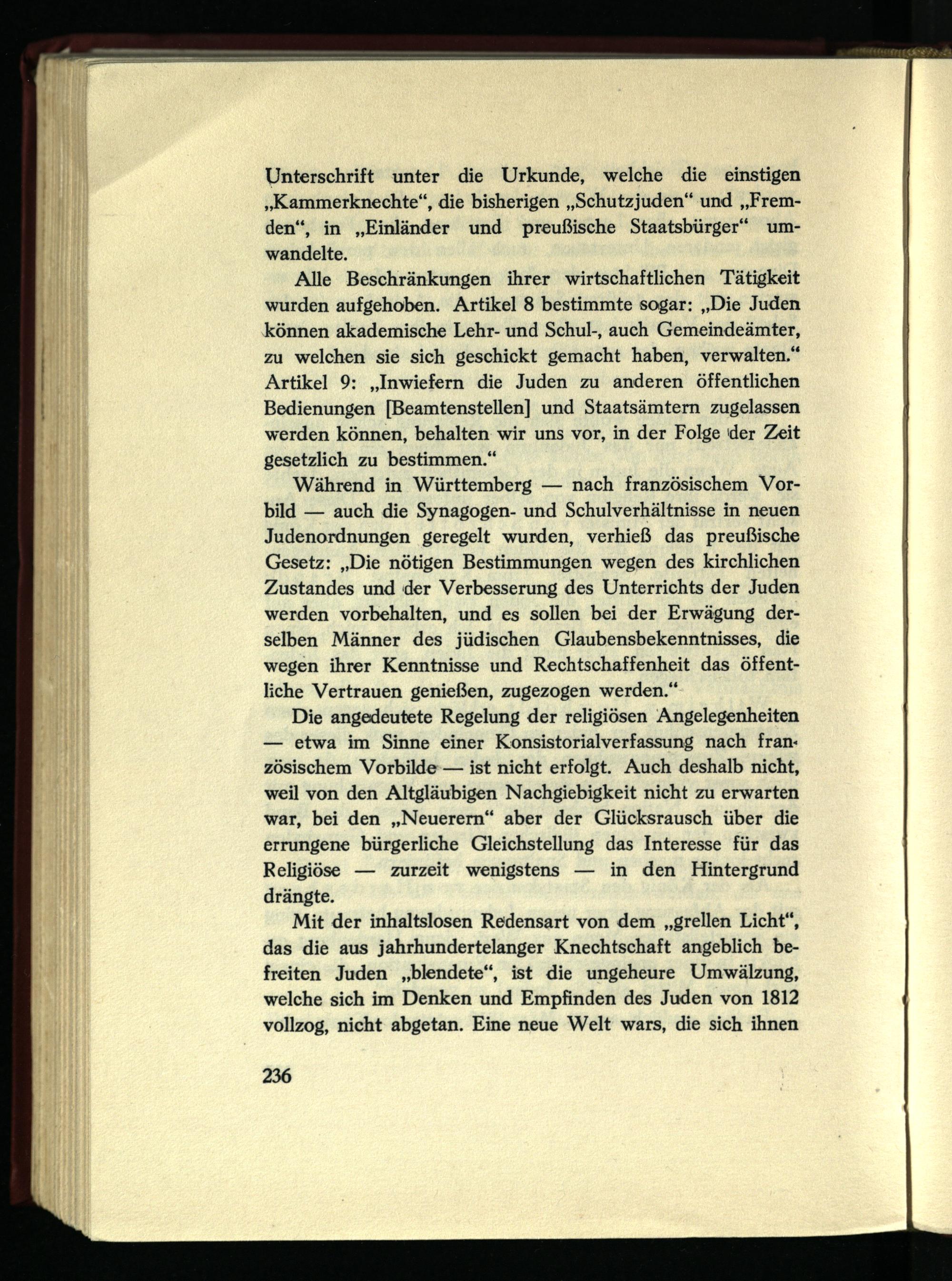 Mit der inhaltslosen Redensart von dem „grellen Licht“, das die aus jahrhundertelanger Knechtschaft angeblich befreiten Juden „blendete“, ist die ungeheure Umwälzung, welche sich im Denken und Empfinden des Juden von 1812 vollzog, nicht abgetan. Eine neue Welt wars, die sich ihnen