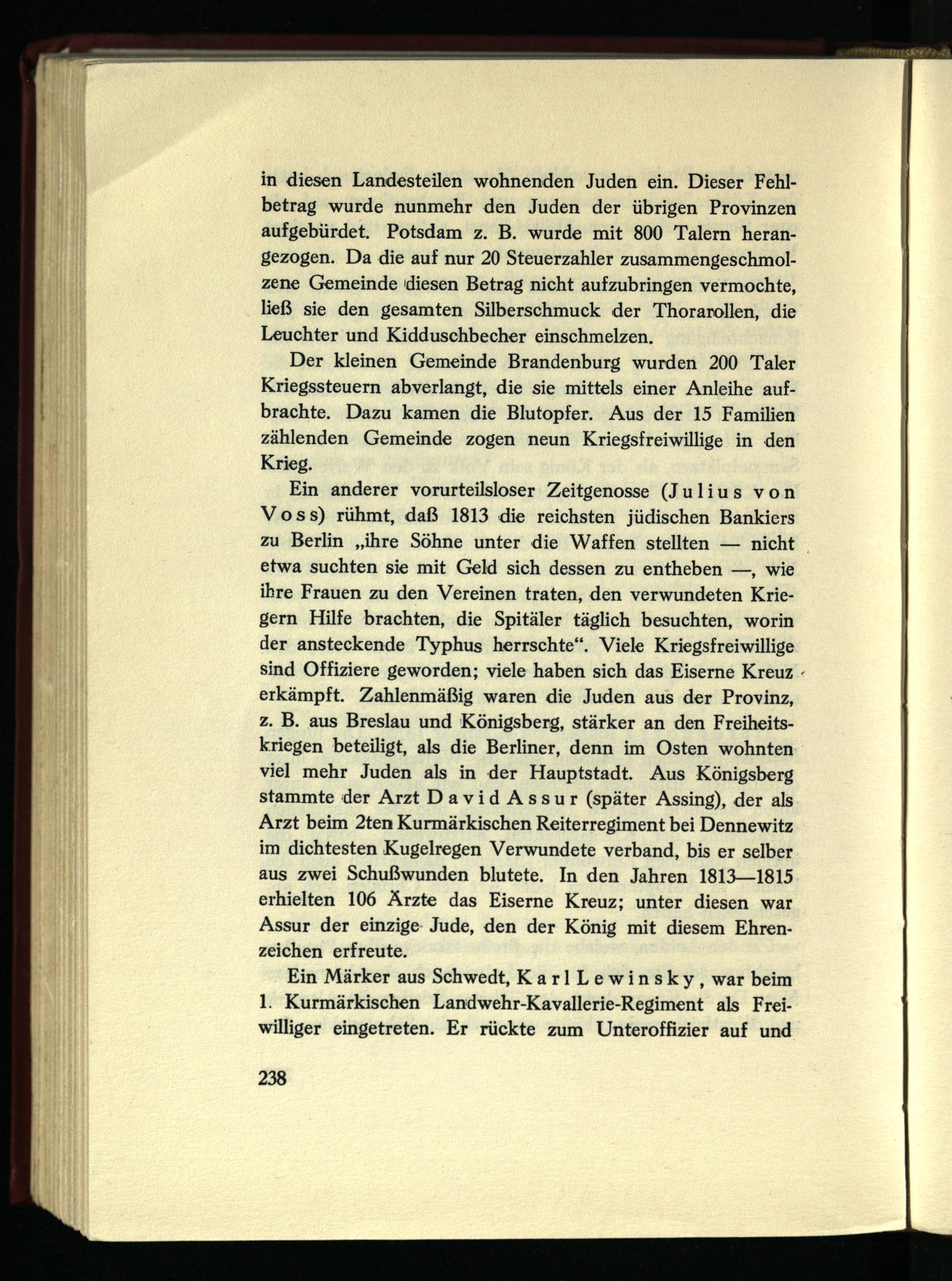 Ein anderer vorurteilsloser Zeitgenosse (Julius von Voss) rühmt, daß 1813 die reichsten jüdischen Bankiers zu Berlin „ihre Söhne unter die Waffen stellten — nicht etwa suchten sie mit Geld sich dessen zu entheben —, wie ihre Frauen zu den Vereinen traten, den verwundeten Kriegern Hilfe brachten, die Spitäler täglich besuchten, worin der ansteckende Typhus herrschte“. Viele Kriegsfreiwillige sind Offiziere geworden; viele haben sich das Eiserne Kreuz erkämpft. Zahlenmäßig waren die Juden aus der Provinz, z. B. aus Breslau und Königsberg, stärker an den Freiheitskriegen beteiligt, als die Berliner, denn im Osten wohnten viel mehr Juden als in der Hauptstadt. Aus Königsberg stammte der Arzt David Assur (später Assing), der als Arzt beim 2ten Kurmärkischen Reiterregiment bei Dennewitz im dichtesten Kugelregen Verwundete verband, bis er selber aus zwei Schußwunden blutete. In den Jahren 1813—1815 erhielten 106 Ärzte das Eiserne Kreuz; unter diesen war Assur der einzige Jude, den der König mit diesem Ehrenzeichen erfreute.