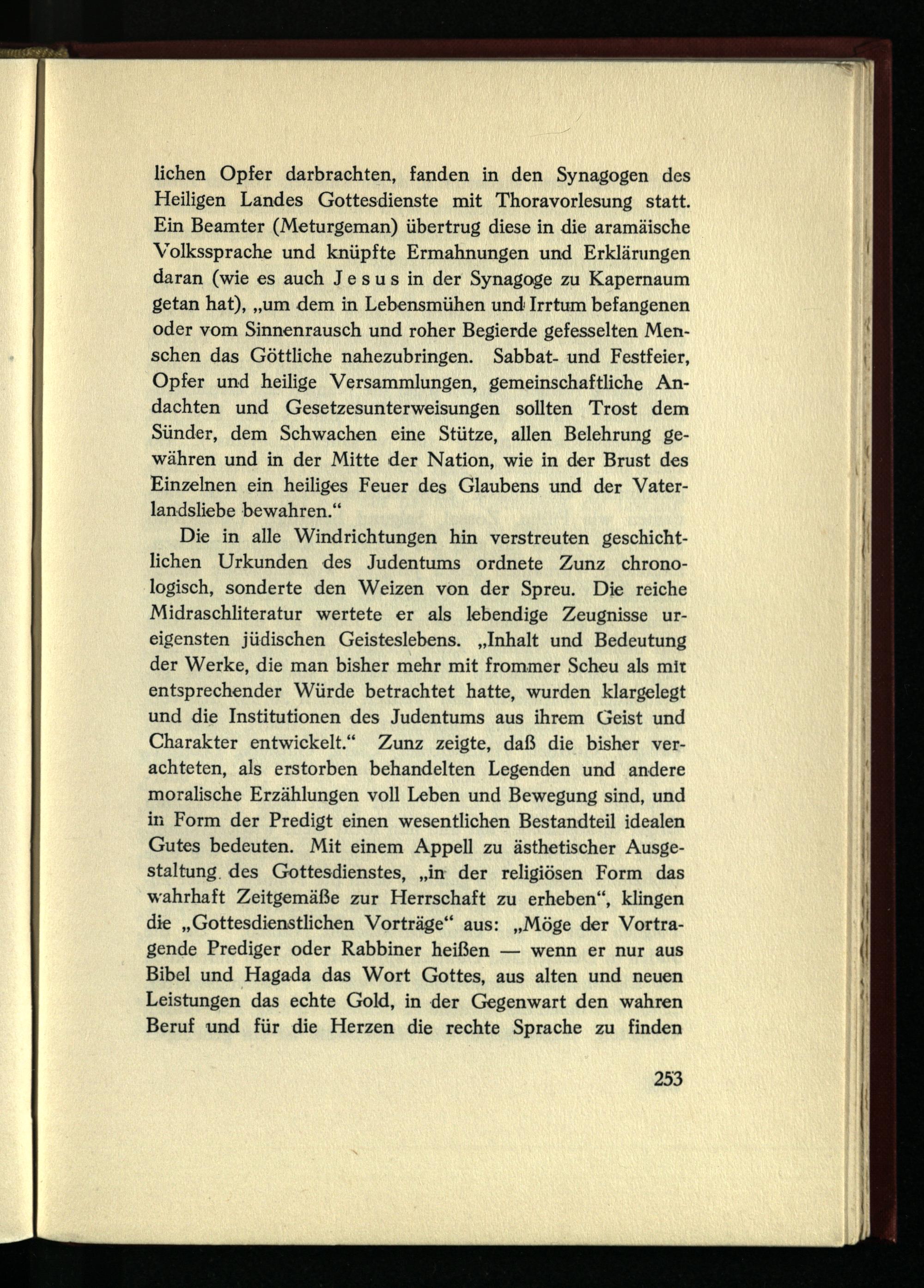 Die in alle Windrichtungen hin verstreuten geschichtlichen Urkunden des Judentums ordnete Zunz chronologisch, sonderte den Weizen von der Spreu. Die reiche Midraschliteratur wertete er als lebendige Zeugnisse ureigensten jüdischen Geisteslebens. „Inhalt und Bedeutung der Werke, die man bisher mehr mit frommer Scheu als mit entsprechender Würde betrachtet hatte, wurden klargelegt und die Institutionen des Judentums aus ihrem Geist und Charakter entwickelt.“ Zunz zeigte, daß die bisher verachteten, als erstorben behandelten Legenden und andere moralische Erzählungen voll Leben und Bewegung sind, und in Form der Predigt einen wesentlichen Bestandteil idealen Gutes bedeuten. Mit einem Appell zu ästhetischer Ausgestaltung des Gottesdienstes, „in der religiösen Form das wahrhaft Zeitgemäße zur Herrschaft zu erheben“, klingen die „Gottesdienstlichen Vorträge“ aus: „Möge der Vortragende Prediger oder Rabbiner heißen — wenn er nur aus Bibel und Hagada das Wort Gottes, aus alten und neuen Leistungen das echte Gold, in der Gegenwart den wahren Beruf und für die Herzen die rechte Sprache zu finden