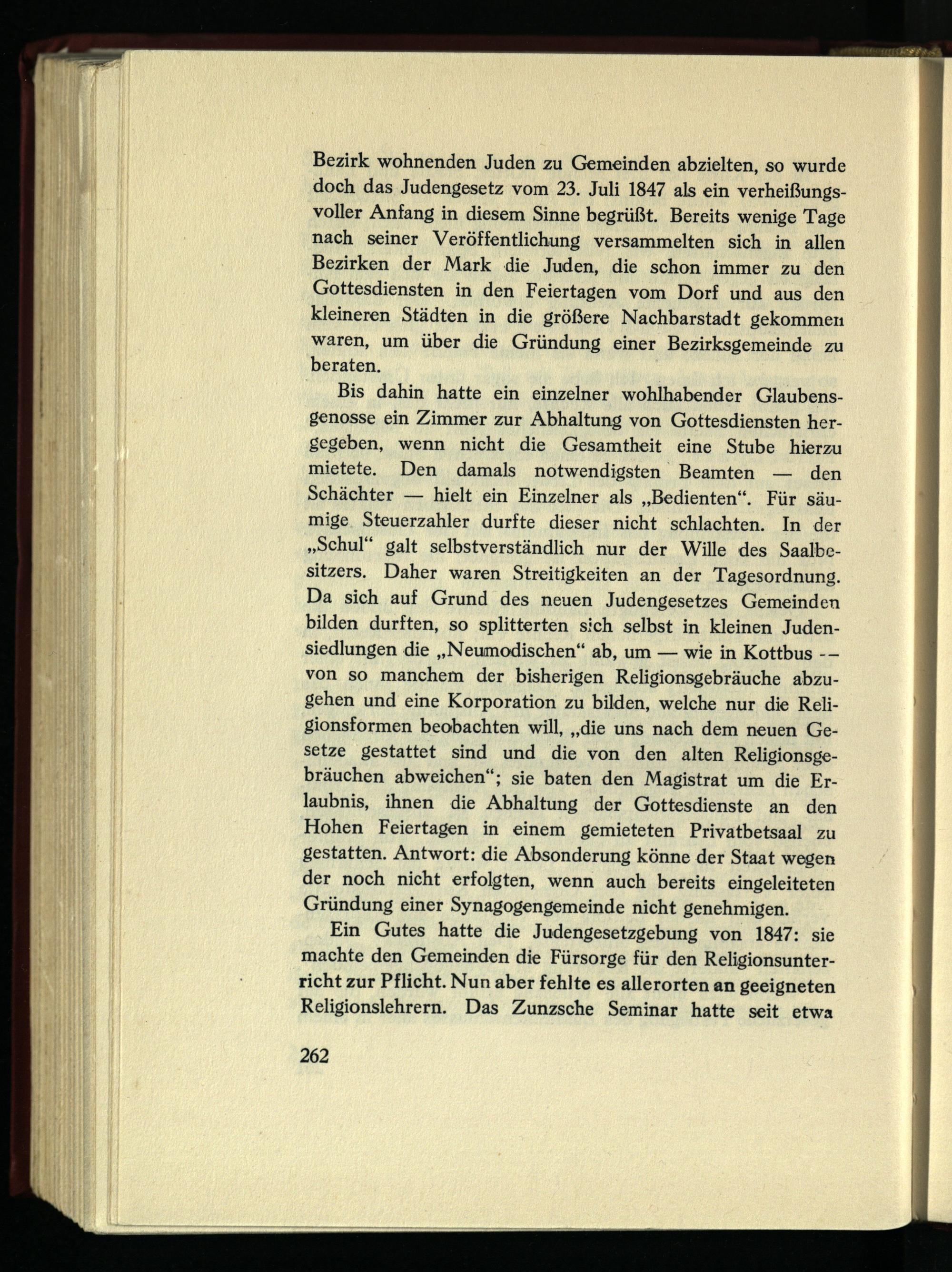 Bis dahin hatte ein einzelner wohlhabender Glaubensgenosse ein Zimmer zur Abhaltung von Gottesdiensten hergegeben, wenn nicht die Gesamtheit eine Stube hierzu mietete. Den damals notwendigsten Beamten — den Schächter — hielt ein Einzelner als „Bedienten“. Für säumige Steuerzahler durfte dieser nicht schlachten. In der „Schul“ galt selbstverständlich nur der Wille des Saalbesitzers. Daher waren Streitigkeiten an der Tagesordnung. Da sich auf Grund des neuen Judengesetzes Gemeinden bilden durften, so splitterten sich selbst in kleinen Judensiedlungen die „Neumodischen“ ab, um — wie in Kottbus — von so manchem der bisherigen Religionsgebräuche abzugehen und eine Korporation zu bilden, welche nur die Religionsformen beobachten will, „die uns nach dem neuen Gesetze gestattet sind und die von den alten Religionsgebräuchen abweichen“; sie baten den Magistrat um die Erlaubnis, ihnen die Abhaltung der Gottesdienste an den Hohen Feiertagen in einem gemieteten Privatbetsaal zu gestatten. Antwort: die Absonderung könne der Staat wegen der noch nicht erfolgten, wenn auch bereits eingeleiteten Gründung einer Synagogengemeinde nicht genehmigen.