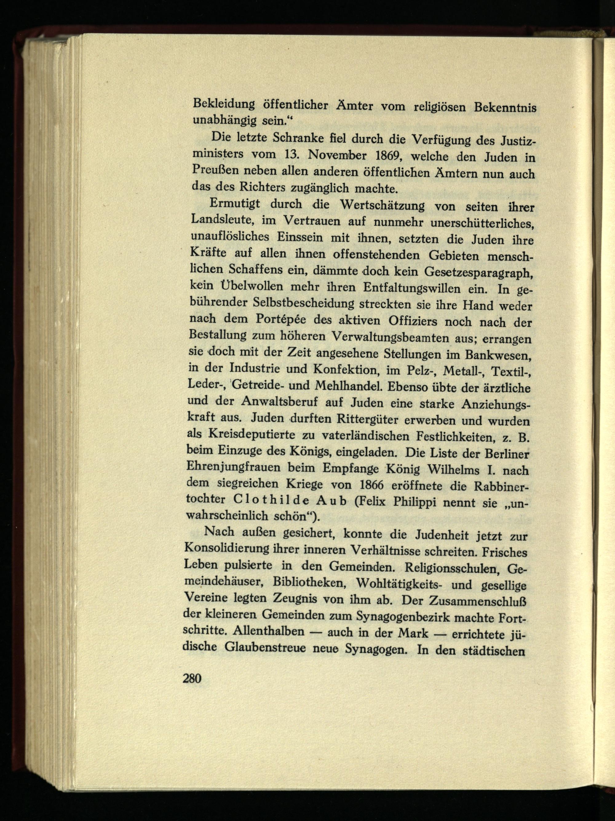 Ermutigt durch die Wertschätzung von seiten ihrer Landsleute, im Vertrauen auf nunmehr unerschütterliches, unauflösliches Einssein mit ihnen, setzten die Juden ihre Kräfte auf allen ihnen offenstehenden Gebieten menschlichen Schaffens ein, dämmte doch kein Gesetzesparagraph, kein Übelwollen mehr ihren Entfaltungswillen ein. In gebührender Selbstbescheidung streckten sie ihre Hand weder nach dem Portépée des aktiven Offiziers noch nach der Bestallung zum höheren Verwaltungsbeamten aus; errangen sie doch mit der Zeit angesehene Stellungen im Bankwesen, in der Industrie und Konfektion, im Pelz-, Metall-, Textil-, Leder-, Getreide- und Mehlhandel. Ebenso übte der ärztliche und der Anwaltsberuf auf Juden eine starke Anziehungskraft aus. Juden durften Rittergüter erwerben und wurden als Kreisdeputierte zu vaterländischen Festlichkeiten, z. B. beim Einzuge des Königs, eingeladen. Die Liste der Berliner Ehrenjungfrauen beim Empfange König Wilhelms I. nach dem siegreichen Kriege von 1866 eröffnete die Rabbinertochter Clothilde Aub (Felix Philippi nennt sie „unwahrscheinlich schön“).