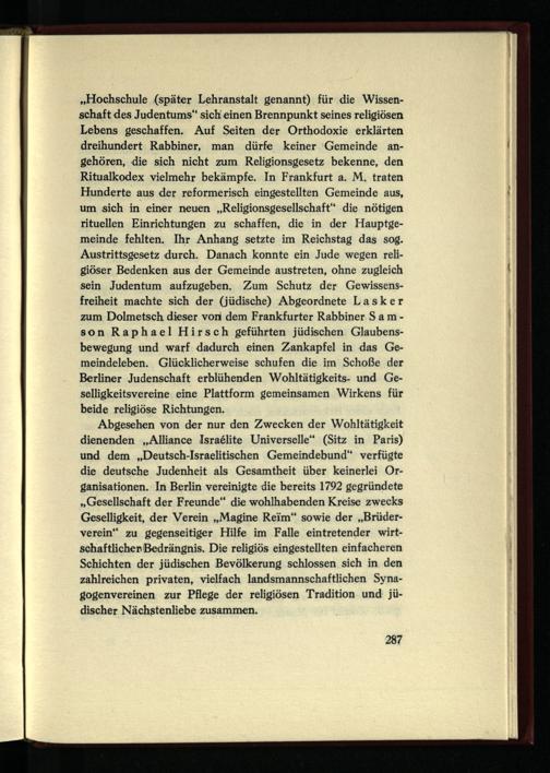 „Hochschule (später Lehranstalt genannt) für die Wissenschaft des Judentums“ sich einen Brennpunkt seines religiösen Lebens geschaffen. Auf Seiten der Orthodoxie erklärten dreihundert Rabbiner, man dürfe keiner Gemeinde angehören, die sich nicht zum Religionsgesetz bekenne, den Ritualkodex vielmehr bekämpfe. In Frankfurt a. M. traten Hunderte aus der reformerisch eingestellten Gemeinde aus, um sich in einer neuen „Religionsgesellschaft“ die nötigen rituellen Einrichtungen zu schaffen, die in der Hauptgemeinde fehlten. Ihr Anhang setzte im Reichstag das sog. Austrittsgesetz durch. Danach konnte ein Jude wegen religiöser Bedenken aus der Gemeinde austreten, ohne zugleich sein Judentum aufzugeben. Zum Schutz der Gewissensfreiheit machte sich der (jüdische) Abgeordnete Lasker zum Dolmetsch dieser von dem Frankfurter Rabbiner Samson Raphael Hirsch geführten jüdischen Glaubensbewegung und warf dadurch einen Zankapfel in das Gemeindeleben. Glücklicherweise schufen die im Schoße der Berliner Judenschaft erblühenden Wohltätigkeits- und Geselligkeitsvereine eine Plattform gemeinsamen Wirkens für beide religiöse Richtungen.