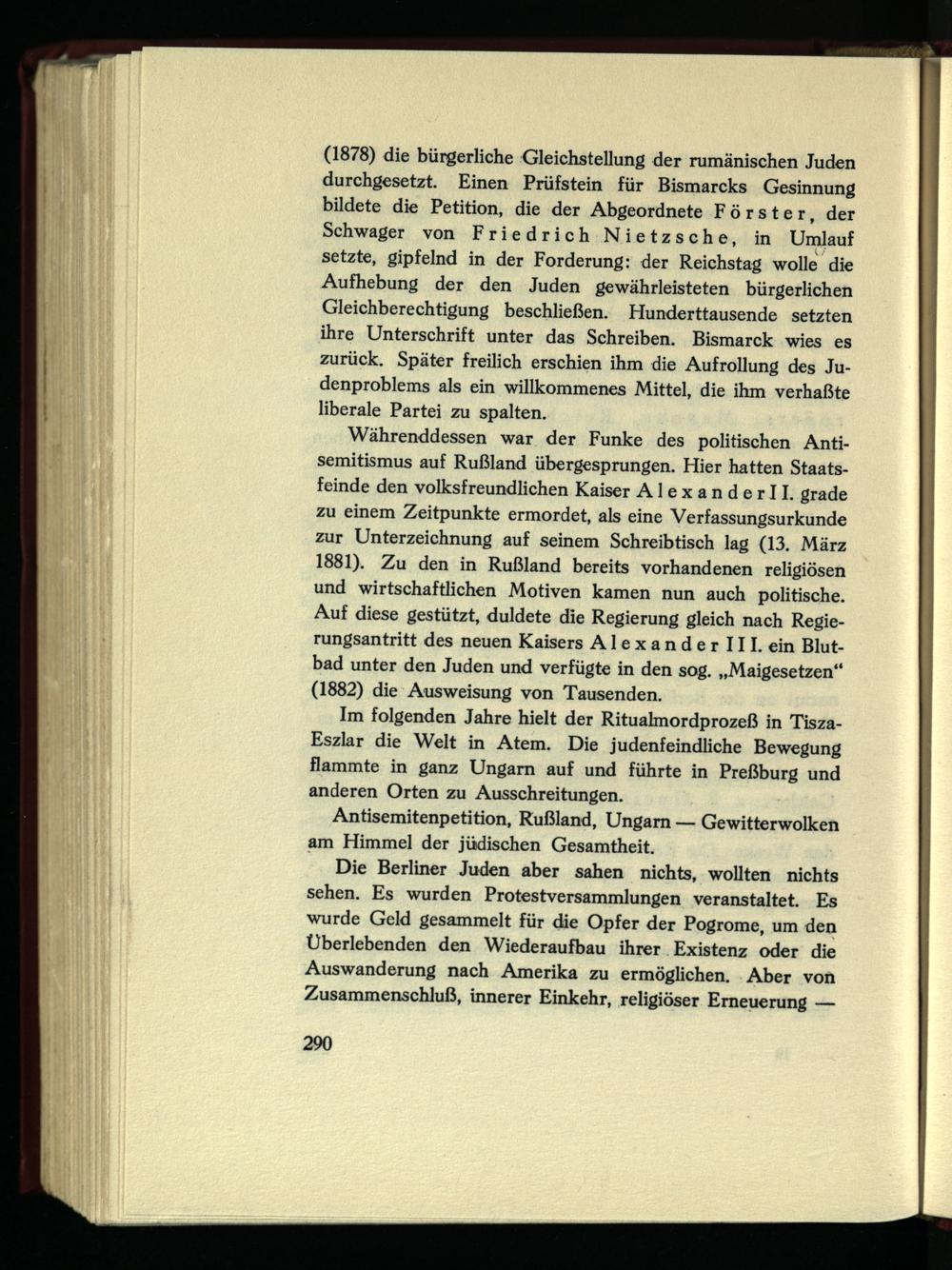 (1878) die bürgerliche Gleichstellung der rumänischen Juden durchgesetzt. Einen Prüfstein für Bismarcks Gesinnung bildete die Petition, die der Abgeordnete Förster, der Schwager von Friedrich Nietzsche, in Umlauf setzte, gipfelnd in der Forderung: der Reichstag wolle die Aufhebung der den Juden gewährleisteten bürgerlichen Gleichberechtigung beschließen. Hunderttausende setzten ihre Unterschrift unter das Schreiben. Bismarck wies es zurück. Später freilich erschien ihm die Aufrollung des Judenproblems als ein willkommenes Mittel, die ihm verhaßte liberale Partei zu spalten.