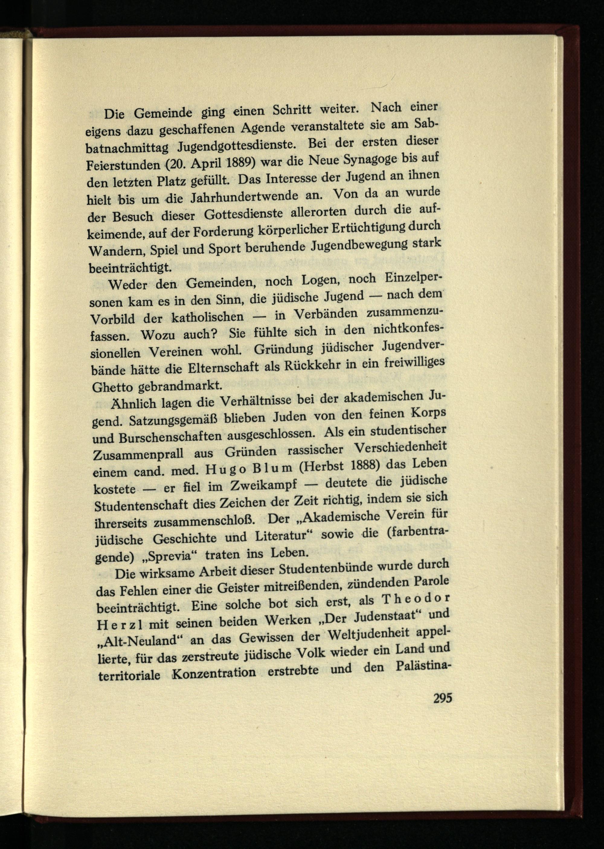 Ähnlich lagen die Verhältnisse bei der akademischen Jugend. Satzungsgemäß blieben Juden von den feinen Korps und Burschenschaften ausgeschlossen. Als ein studentischer Zusammenprall aus Gründen rassischer Verschiedenheit einem cand. med. Hugo Blum (Herbst 1888) das Leben kostete — er fiel im Zweikampf — deutete die jüdische Studentenschaft dies Zeichen der Zeit richtig, indem sie sich ihrerseits zusammenschloß. Der „Akademische Verein für jüdische Geschichte und Literatur“ sowie die (farbentra- gende) „Sprevia“ traten ins Leben.