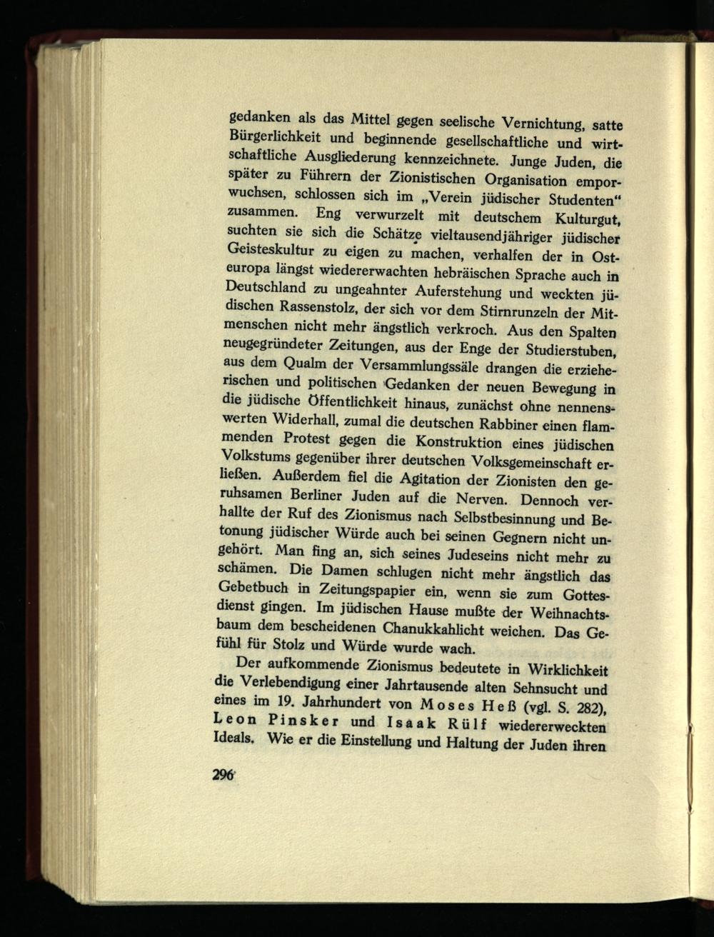 gedanken als das Mittel gegen seelische Vernichtung, satte Bürgerlichkeit und beginnende gesellschaftliche und wirtschaftliche Ausgliederung kennzeichnete. Junge Juden, die später zu Führern der Zionistischen Organisation emporwuchsen, schlossen sich im „Verein jüdischer Studenten“ zusammen. Eng verwurzelt mit deutschem Kulturgut, suchten sie sich die Schätze vieltausendjähriger jüdischer Geisteskultur zu eigen zu machen, verhalten der in Osteuropa längst wiedererwachten hebräischen Sprache auch in Deutschland zu ungeahnter Auferstehung und weckten jüdischen Rassenstolz, der sich vor dem Stirnrunzeln der Mitmenschen nicht mehr ängstlich verkroch. Aus den Spalten neugegründeter Zeitungen, aus der Enge der Studierstuben, aus dem Qualm der Versammlungssäle drangen die erzieherischen und politischen Gedanken der neuen Bewegung in die jüdische Öffentlichkeit hinaus, zunächst ohne nennenswerten Widerhall, zumal die deutschen Rabbiner einen flammenden Protest gegen die Konstruktion eines jüdischen Volkstums gegenüber ihrer deutschen Volksgemeinschaft erließen. Außerdem fiel die Agitation der Zionisten den geruhsamen Berliner Juden auf die Nerven. Dennoch verhallte der Ruf des Zionismus nach Selbstbesinnung und Betonung jüdischer Würde auch bei seinen Gegnern nicht un- gehört. Man fing an, sich seines Judeseins nicht mehr zu schämen. Die Damen schlugen nicht mehr ängstlich das Gebetbuch in Zeitungspapier ein, wenn sie zum Gottesdienst gingen. Im jüdischen Hause mußte der Weihnachtsbaum dem bescheidenen Chanukkahlicht weichen. Das Gefühl für Stolz und Würde wurde wach.