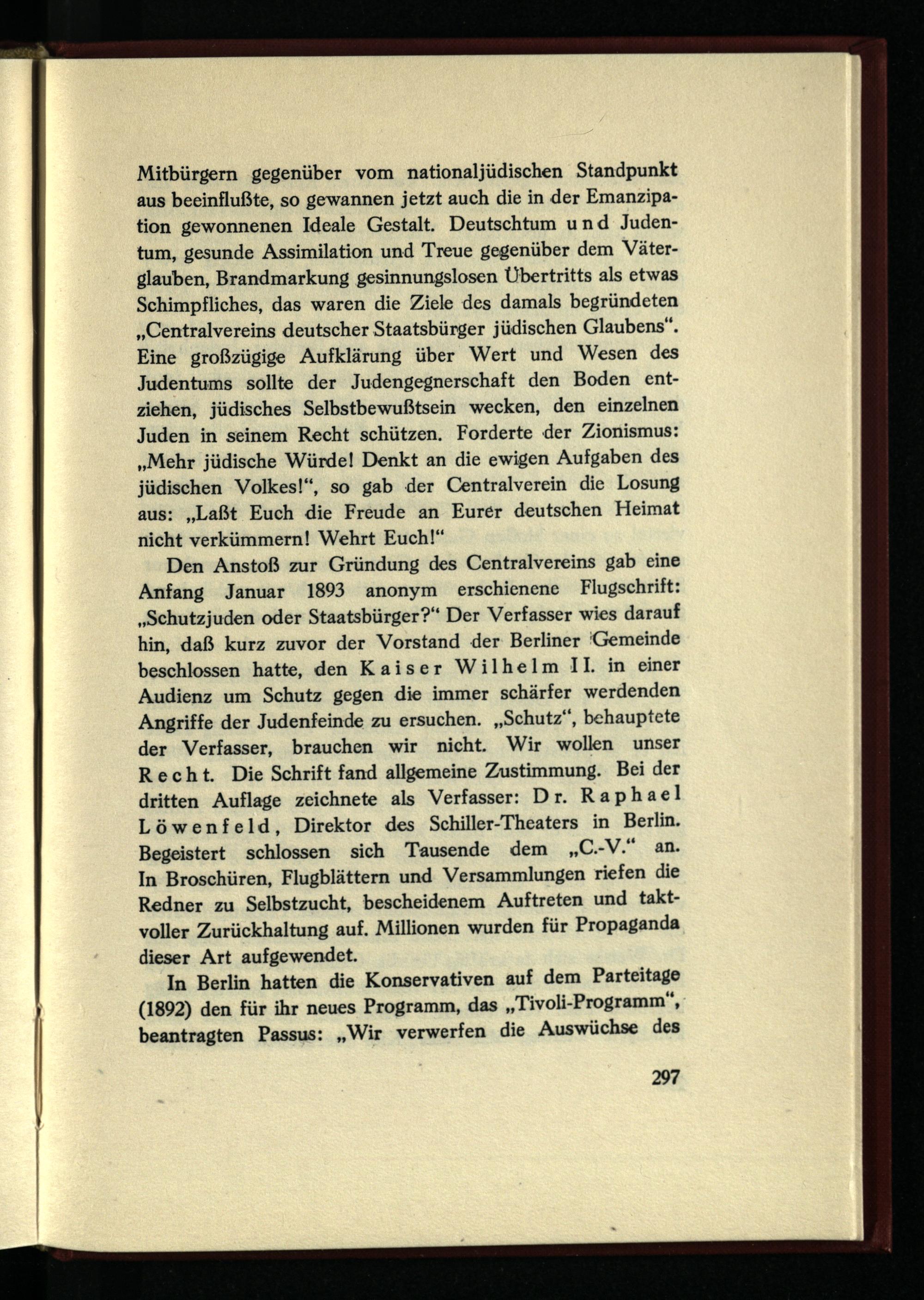 Den Anstoß zur Gründung des Centralvereins gab eine Anfang Januar 1893 anonym erschienene Flugschrift: „Schutzjuden oder Staatsbürger?“ Der Verfasser wies darauf hin, daß kurz zuvor der Vorstand der Berliner Gemeinde beschlossen hatte, den Kaiser Wilhelm II. in einer Audienz um Schutz gegen die immer schärfer werdenden Angriffe der Judenfeinde zu ersuchen. „Schutz“, behauptete der Verfasser, brauchen wir nicht. Wir wollen unser Recht. Die Schrift fand allgemeine Zustimmung. Bei der dritten Auflage zeichnete als Verfasser: Dr. Raphael Löwenfeld, Direktor des Schiller-Theaters in Berlin. Begeistert schlossen sich Tausende dem „C.-V.“ an. In Broschüren, Flugblättern und Versammlungen riefen die Redner zu Selbstzucht, bescheidenem Auftreten und taktvoller Zurückhaltung auf. Millionen wurden für Propaganda dieser Art aufgewendet.