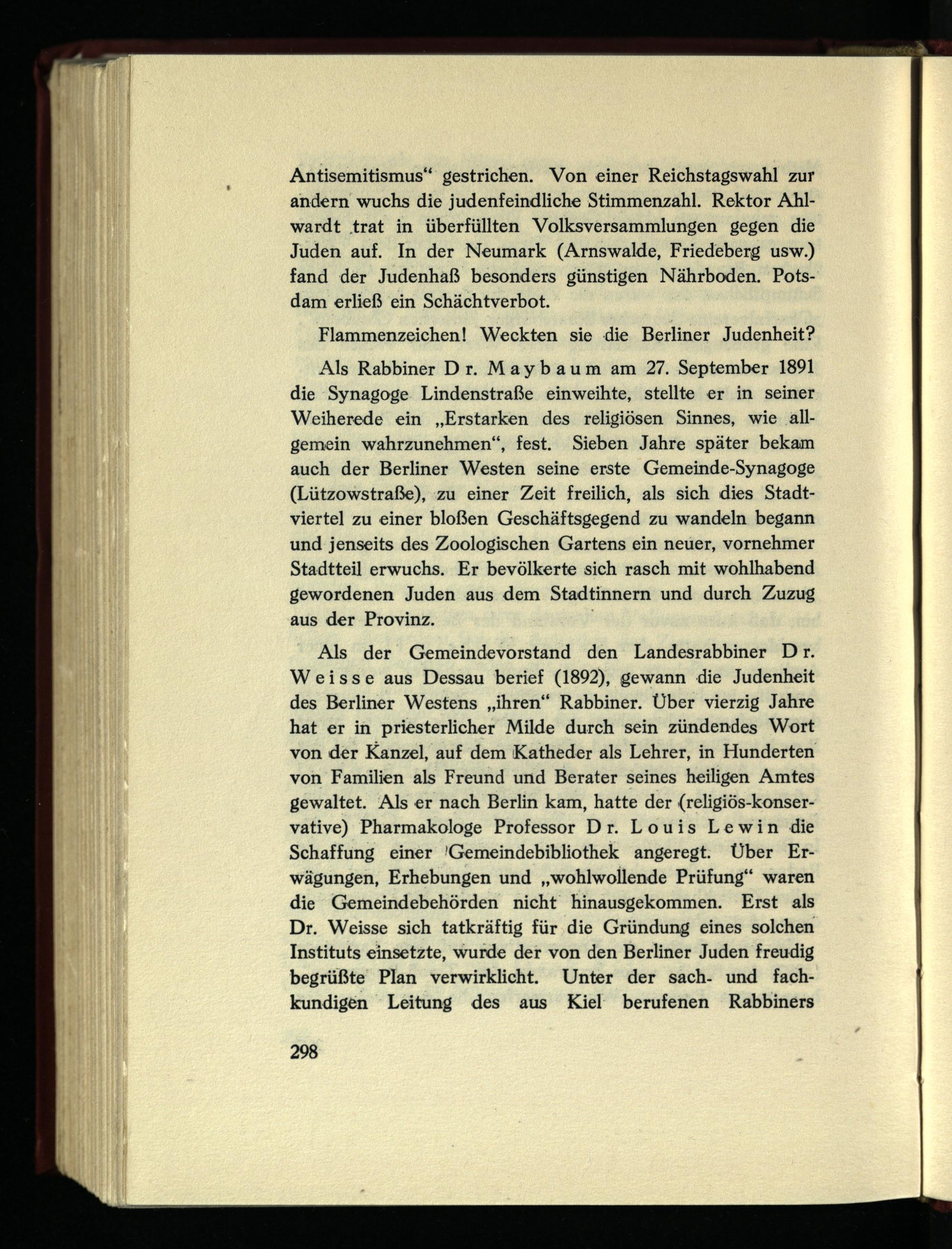 Als der Gemeindevorstand den Landesrabbiner Dr. Weisse aus Dessau berief (1892), gewann die Judenheit des Berliner Westens „ihren“ Rabbiner. Über vierzig Jahre hat er in priesterlicher Milde durch sein zündendes Wort von der Kanzel, auf dem Katheder als Lehrer, in Hunderten von Familien als Freund und Berater seines heiligen Amtes gewaltet. Als er nach Berlin kam, hatte der (religiös-konservative) Pharmakologe Professor Dr. Louis Lewin die Schaffung einer Gemeindebibliothek angeregt. Über Erwägungen, Erhebungen und „wohlwollende Prüfung“ waren die Gemeindebehörden nicht hinausgekommen. Erst als Dr. Weisse sich tatkräftig für die Gründung eines solchen Instituts einsetzte, wurde der von den Berliner Juden freudig begrüßte Plan verwirklicht. Unter der sach- und fachkundigen Leitung des aus Kiel berufenen Rabbiners
