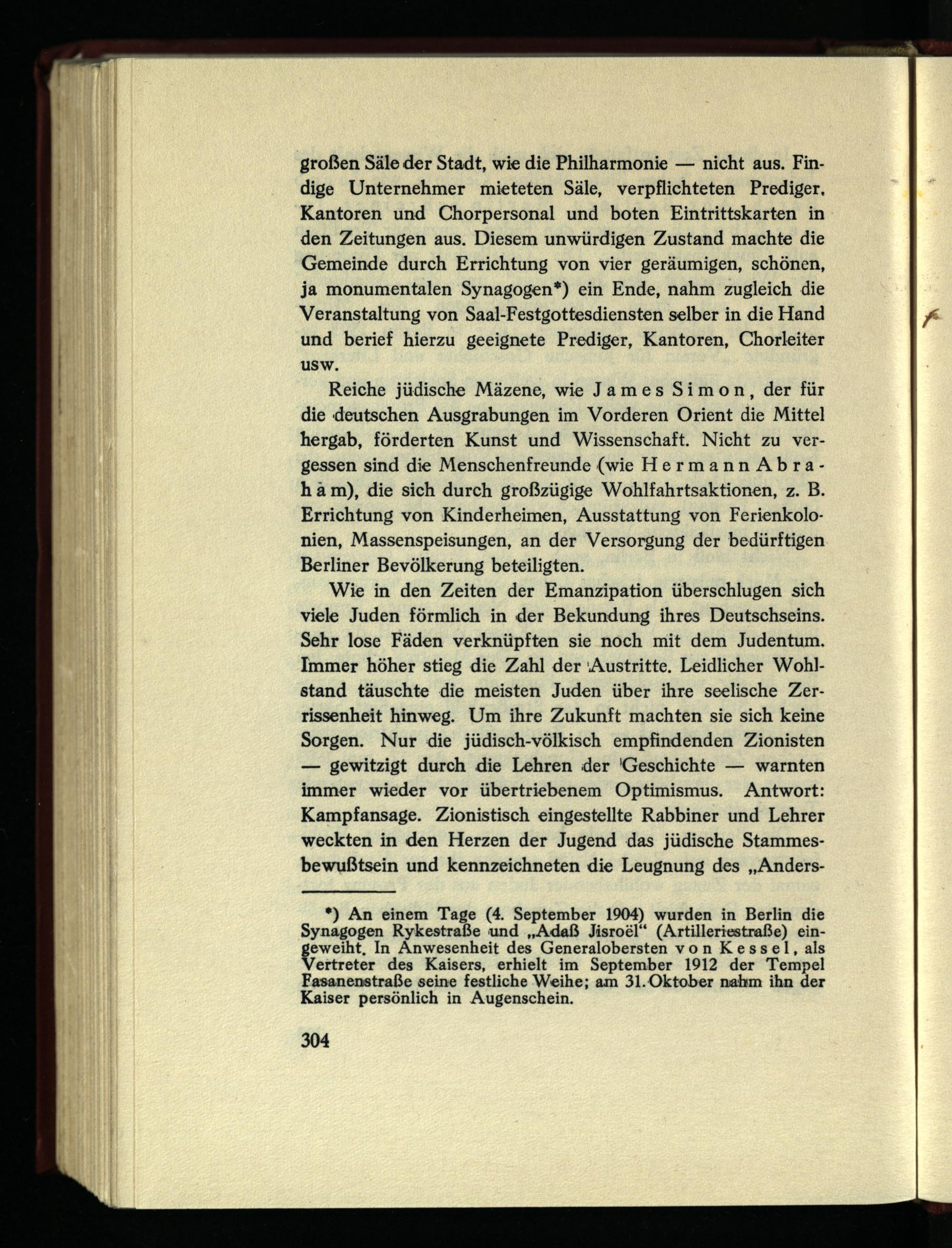 *) An einem Tage (4. September 1904) wurden in Berlin die Synagogen Rykestraße und „Adaß Jdsroel“ (Artillerieestraße) eingeweiht. In Anwesenheit des Generalobersten von Kessel, als Vertreter des Kaisers, erhielt im September 1912 der Tempel Fasanenstraße seine festliche Weihe; am 31. Oktober nahm ihn der Kaiser persönlich in Augenschein.
