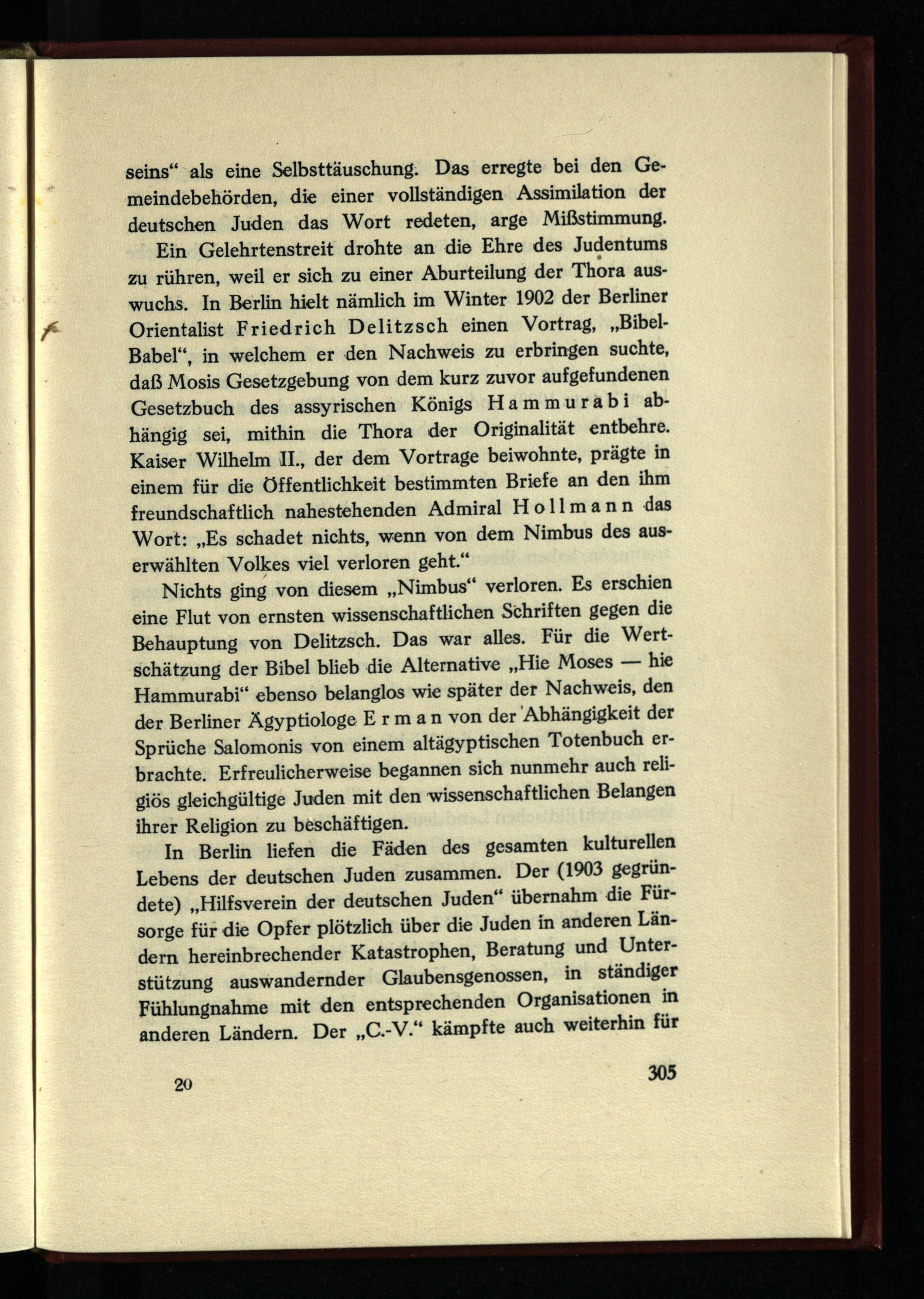 Nichts ging von diesem „Nimbus“ verloren. Es erschien eine Flut von ernsten wissenschaftlichen Schriften gegen die Behauptung von Delitzsch. Das war alles. Für die Wertschätzung der Bibel blieb die Alternative „Hie Moses — hie Hammurabi“ ebenso belanglos wie später der Nachweis, den der Berliner Ägyptiologe Erman von der Abhängigkeit der Sprüche Salomonis von einem altägyptischen Totenbuch erbrachte. Erfreulicherweise begannen sich nunmehr auch religiös gleichgültige Juden mit den wissenschaftlichen Belangen ihrer Religion zu beschäftigen.