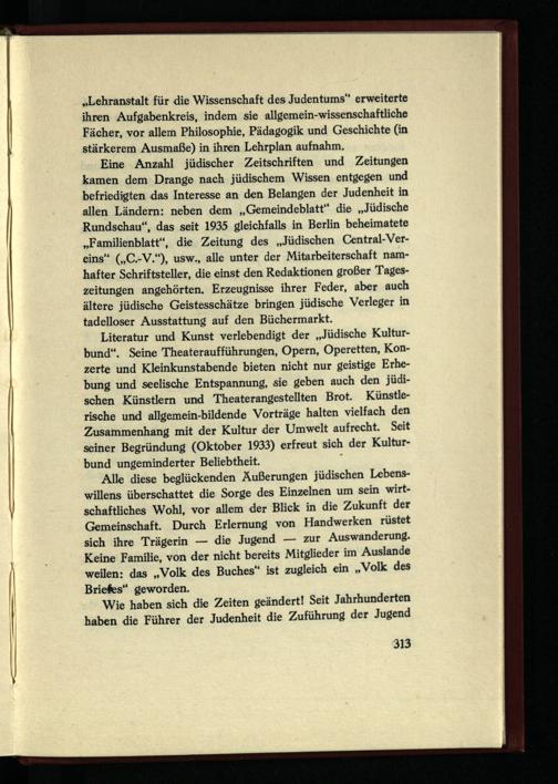 Eine Anzahl jüdischer Zeitschriften und Zeitungen kamen dem Drange nach jüdischem Wissen entgegen und befriedigten das Interesse an den Belangen der Judenheit in allen Ländern: neben dem „Gemeindeblatt“ die „Jüdische Rundschau“, das seit 1935 gleichfalls in Berlin beheimatete „Familienblatt“, die Zeitung des „Jüdischen Central-Ver- eins“ („C.-V.“), usw., alle unter der Mitarbeiterschaft namhafter Schriftsteller, die einst den Redaktionen großer Tageszeitungen angehörten. Erzeugnisse ihrer Feder, aber auch ältere jüdische Geistesschätze bringen jüdische Verleger in tadelloser Ausstattung auf den Büchermarkt.
