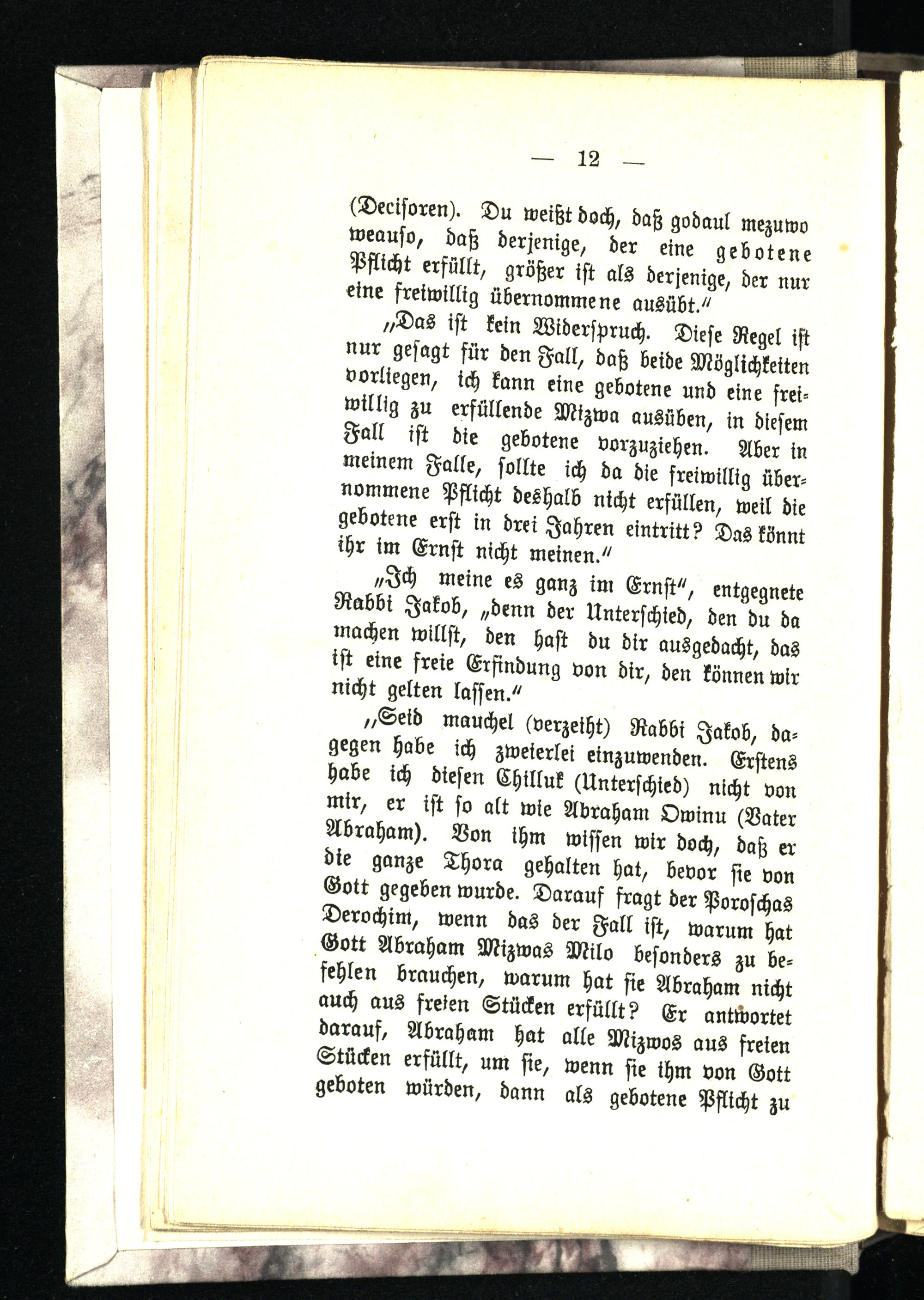 „Seid mauchel (verzeiht) Rabbi Jakob, dagegen habe ich zweierlei etnzuwenden. Erstens habe ich diesen Chilluk (Unterschied) nicht von mir, er ist so alt wie Abraham Owinu (Vater Abraham). Von ihm wissen wir doch, daß er die ganze Thora gehalten hat, bevor sie von Gott gegeben wurde. Darauf fragt der Poroschas Derochim, wenn das der Fall ist, warum hat Gott Abraham Mizwas Milo besonders zu befehlen brauchen, warum hat sie Abraham nicht auch aus freien Stücken erfüllt? Er antwortet darauf, Abraham hat alle Mizwos aus freien Stücken erfüllt, um sie, wenn sie ihm von Gott geboten würden, dann als gebotene Pflicht zu