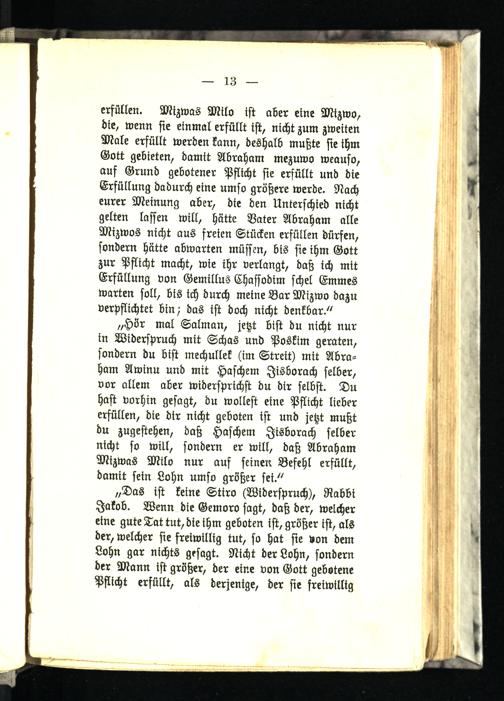„Das ist keine Stiro (Widerspruch), Rabbi Jakob. Wenn die Gemoro sagt, daß der, welcher eine gute Tat tut, die ihm geboten ist, größer ist, als der, welcher sie freiwillig tut, so hat sie von dem Lohn gar nichts gesagt. Nicht der Lohn, sondern der Mann ist größer, der eine von Gott gebotene Pflicht erfüllt, als derjenige, der sie freiwillig