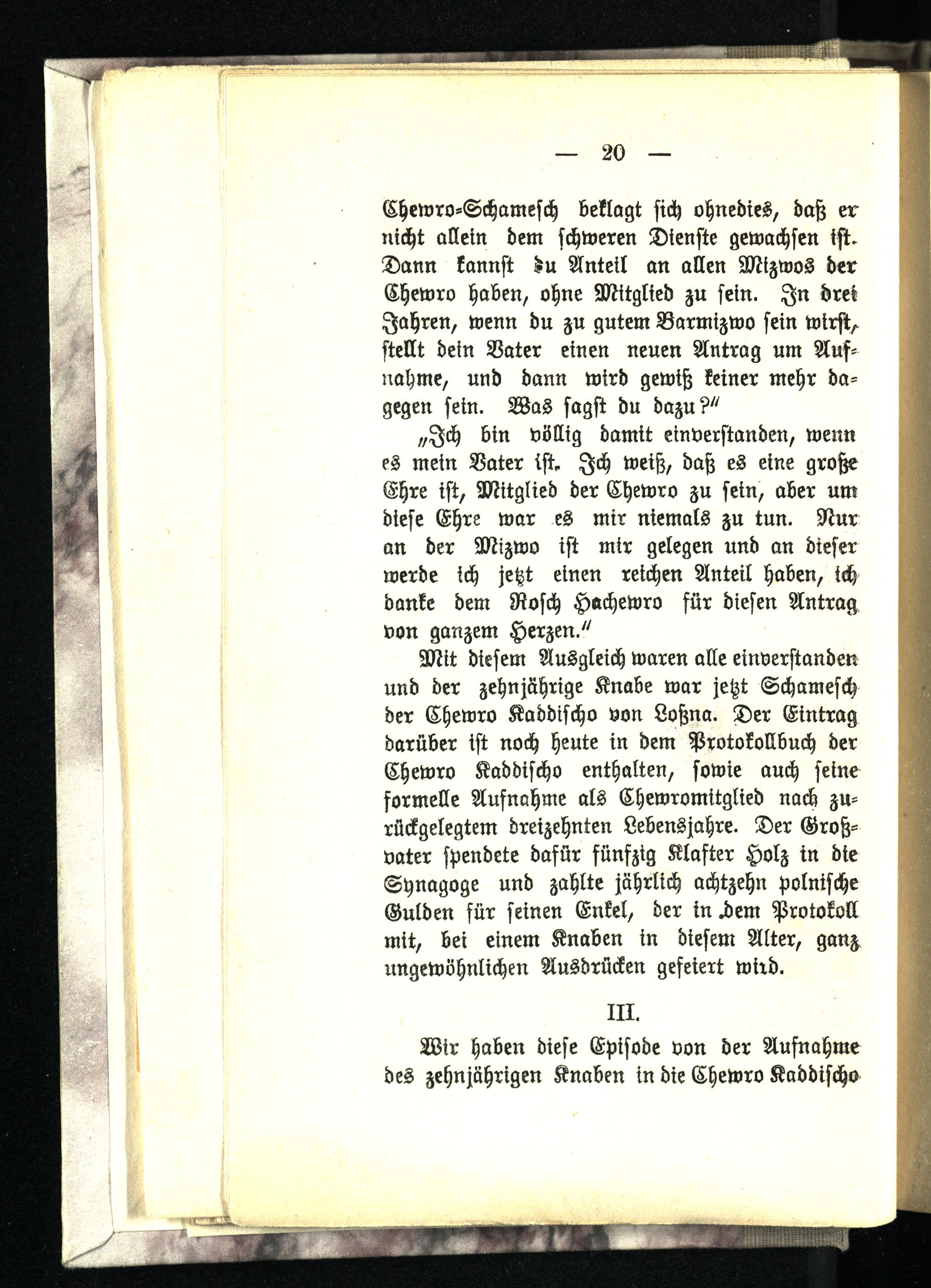 Mit diesem Ausgleich waren alle einverstanden und der zehnjährige Knabe war jetzt Schamesch der Chewro Kaddischo von Loßna. Der Eintrag darüber ist noch heute in dem Protokollbuch der Chewro Kaddischo enthalten, sowie auch seine formelle Aufnahme als Chewromitglied nach zurückgelegtem dreizehnten Lebensjahre. Der Großvater spendete dafür fünfzig Klafter Holz in die Synagoge und zahlte jährlich achtzehn polnische Gulden für seinen Enkel, der in chem Protokoll mit, bei einem Knaben in diesem Alter, ganz ungewöhnlichen Ausdrücken gefeiert wird.