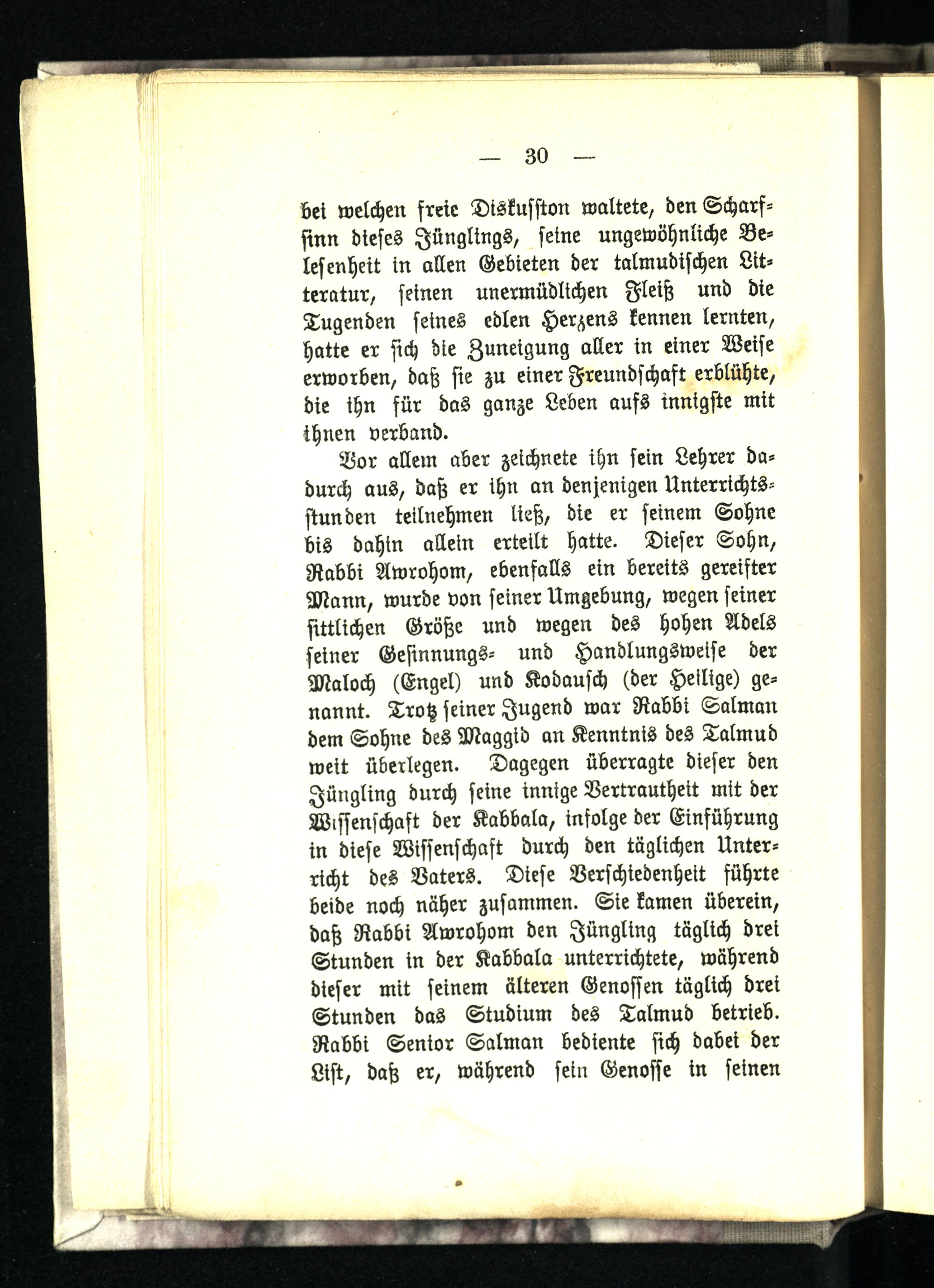 Vor allem aber zeichnete ihn sein Lehrer dadurch aus, daß er ihn an denjenigen Unterrichtsstunden teilnehmen ließ, die er seinem Sohne bis dahin allein erteilt hatte. Dieser Sohn, Rabbi Awrohom, ebenfalls ein bereits gereifter Mann, wurde von seiner Umgebung, wegen seiner sittlichen Größe und wegen des hohen Adels seiner Gefinnungs- und Handlungsweise der Maloch (Engel) und Kodausch (der Heilige) genannt. Trotz seiner Jugend war Rabbi Salman dem Sohne des Maggid an Kenntnis des Talmud weit überlegen. Dagegen überragte dieser den Jüngling durch seine innige Vertrautheit mit der Wissenschaft der Kabbala, infolge der Einführung in diese Wissenschaft durch den täglichen Unterricht des Vaters. Diese Verschiedenheit führte beide noch näher zusammen. Sie kamen überein, daß Rabbi Awrohom den Jüngling täglich drei Stunden in der Kabbala unterrichtete, während dieser mit seinem älteren Genossen täglich drei Stunden das Studium des Talmud betrieb. Rabbi Senior Salman bediente sich dabet der List, daß er, während sein Genosse in seinen
