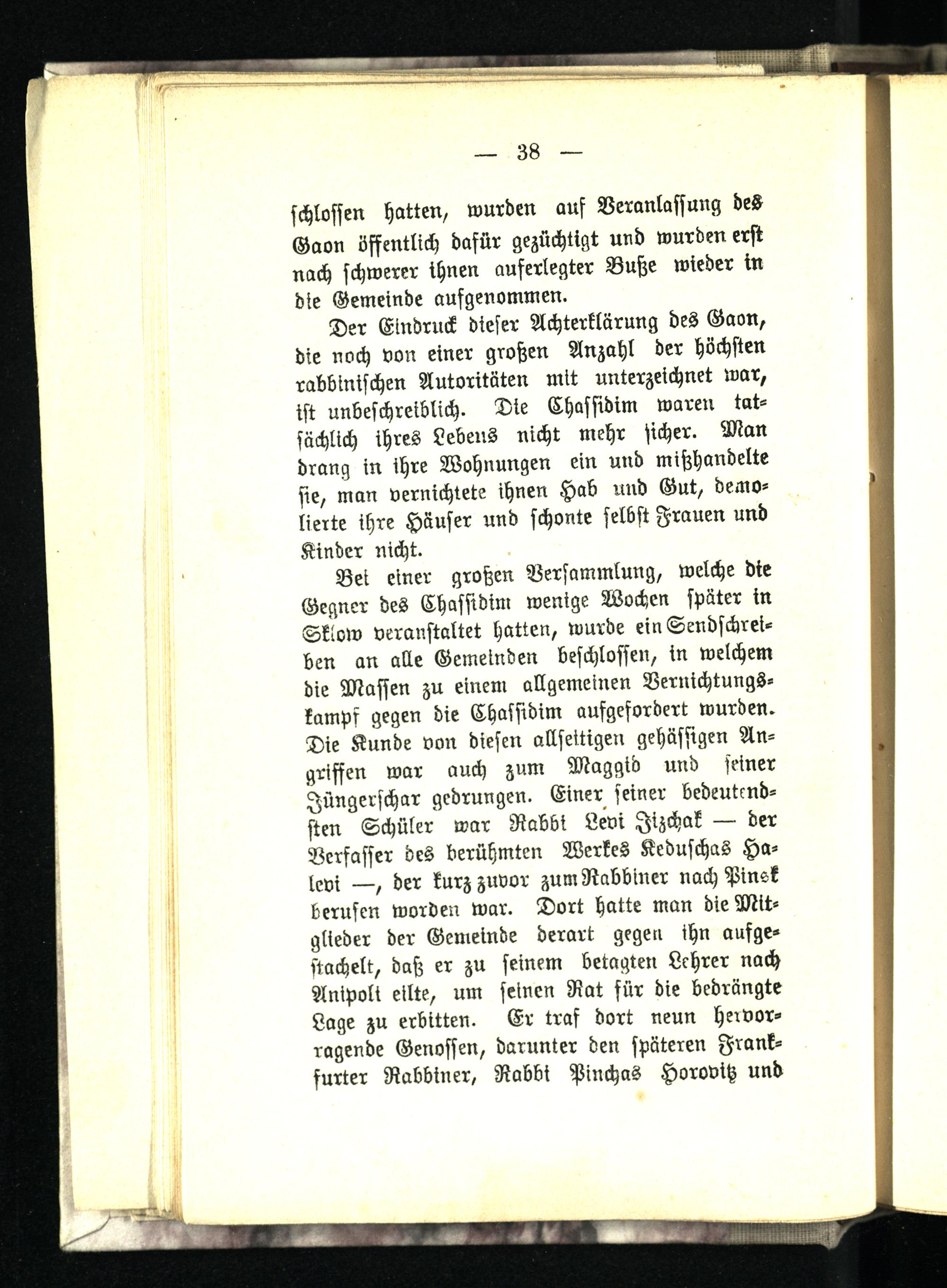 Der Eindruck dieser Achterklärung des Gaon, die noch von einer großen Anzahl der höchsten rabbinischen Autoritäten mit unterzeichnet war, ist unbeschreiblich. Die Chassidim waren tatsächlich ihres Lebens nicht mehr sicher. Man drang in ihre Wohnungen ein und mißhandelte sie, man vernichtete ihnen Hab und Gut, demolierte ihre Häuser und schonte selbst Frauen und Kinder nicht.