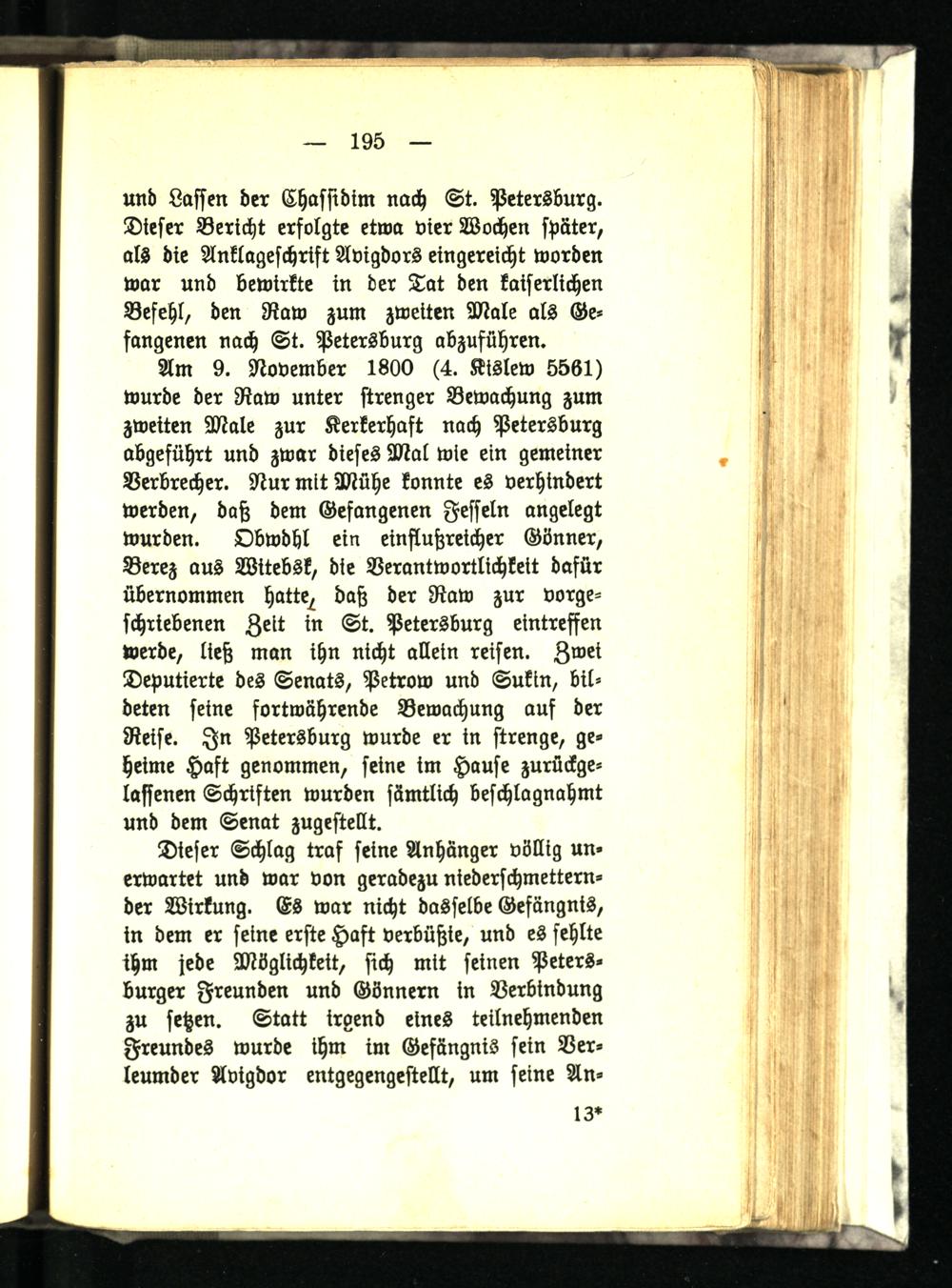 Am 9. November 1800 (4. Kislew 5561) wurde der Raw unter strenger Bewachung zum zweiten Male zur Kerkerhaft nach Petersburg abgeführt und zwar dieses Mal wie ein gemeiner Verbrecher. Nur mit Mühe konnte es verhindert werden, daß dem Gefangenen Fesseln angelegt wurden. Obwdhl ein einflußreicher Gönner, Berez aus Witebsk, die Verantwortlichkeit dafür übernommen hatte, daß der Raw zur vorge- schrtebenen Zeit in St. Petersburg eintreffen werde, ließ man ihn nicht allein reisen. Zwei Deputierte des Senats, Petrow und Sukin, bildeten seine fortwährende Bewachung auf der Reise. In Petersburg wurde er in strenge, geheime Haft genommen, seine im Hause zurückge- lastenen Schriften wurden sämtlich beschlagnahmt und dem Senat zugestellt.