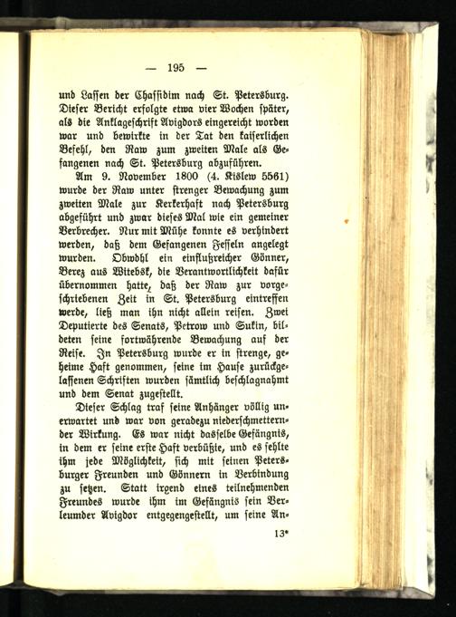 und Lasten der Chasfidim nach St. Petersburg. Dieser Bericht erfolgte etwa vier Wochen später, als die Anklageschrift Avigdors eingereicht worden war und bewirkte in der Tat den kaiserlichen Befehl, den Raw zum zweiten Male als Gefangenen nach St. Petersburg abzusühren.