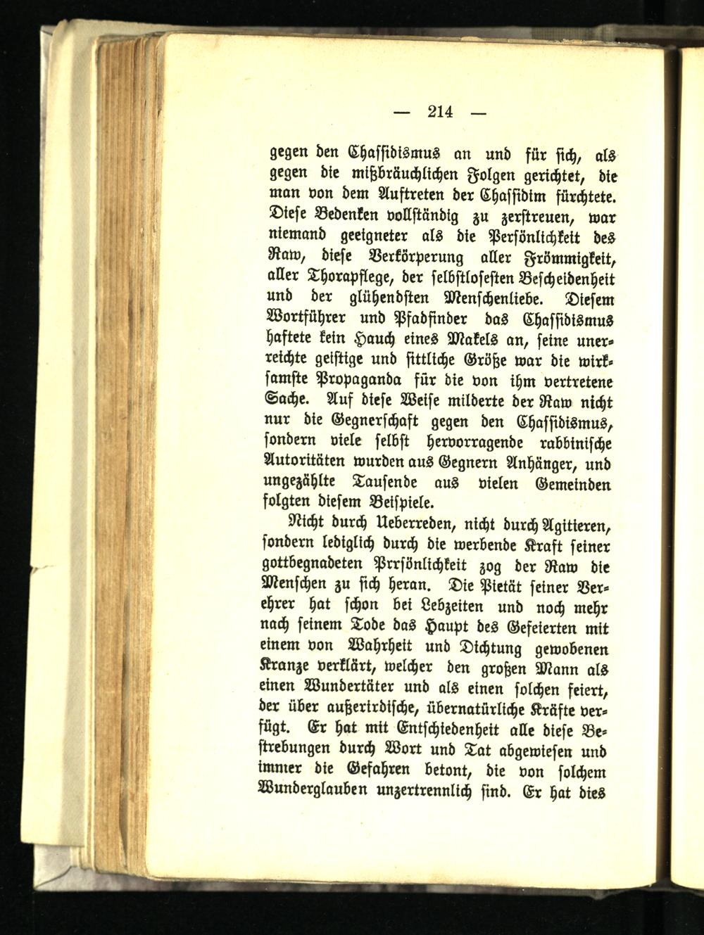 gegen den Chassidismus an und für sich, als gegen die mißbräuchlichen Folgen gerichtet, die man von dem Auftreten der Chassidtm fürchtete. Diese Bedenken vollständig zu zerstreuen, war niemand geeigneter als die Persönlichkeit des Raw, diese Verkörperung aller Frömmigkeit, aller Thorapflege, der selbstlosesten Bescheidenheit und der glühendsten Menschenliebe. Diesem Wortführer und Pfadfinder das Chassidismus haftete kein Hauch eines Makels an, seine unerreichte geistige und sittliche Größe war die wirksamste Propaganda für die von ihm vertretene Sache. Auf diese Weise milderte der Raw nicht nur die Gegnerschaft gegen den Chassidismus, sondern viele selbst hervorragende rabbinische Autoritäten wurden aus Gegnern Anhänger, und ungezählte Tausende aus vielen Gemeinden folgten diesem Beispiele.