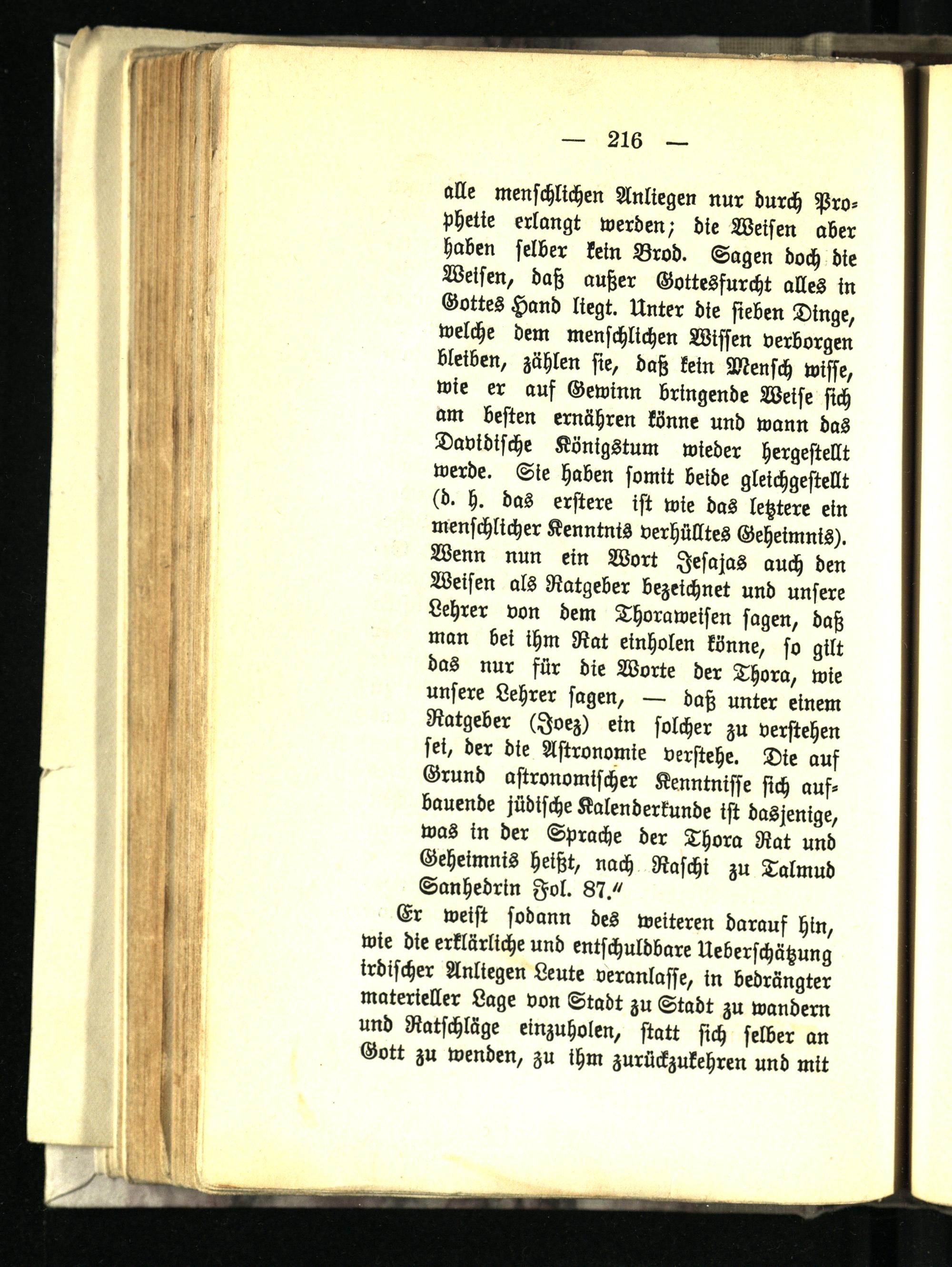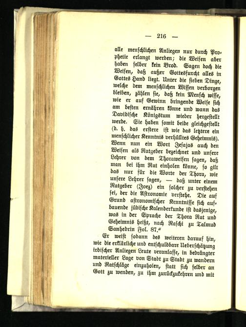 alle menschlichen Anliegen nur durch Prophetie erlangt werden/ die Weisen aber haben selber kein Brod. Sagen doch die Weisen, daß außer Gottesfurcht alles in Gottes Hand liegt. Unter die sieben Dinge, welche dem menschlichen Wissen verborgen bleiben, zählen sie, daß kein Mensch wisse, wie er auf Gewinn bringende Weise sich am besten ernähren könne und wann das Davidische Königstum wieder hergestellt werde. Sie haben somit beide gleichgestellt (d. h. das erstere ist wie das letztere ein menschlicher Kenntnis verhülltes Geheimnis). Wenn nun ein Wort Jesajas auch den Weisen als Ratgeber bezeichnet und unsere Lehrer von dem Thora weisen sagen, daß man bet ihm Rat einholen könne, so gilt das nur für die Worte der Thora, wie unsere Lehrer sagen, — daß unter einem Ratgeber (Joez) ein solcher zu verstehen sei, der die Astronomie verstehe. Die aus Grund astronomischer Kenntnisse sich aufbauende jüdische Kalenderkunde ist dasjenige, was in der Sprache der Thora Rat und Geheimnis heißt, nach Raschi zu Talmud Sanhedrin Fol. 87."