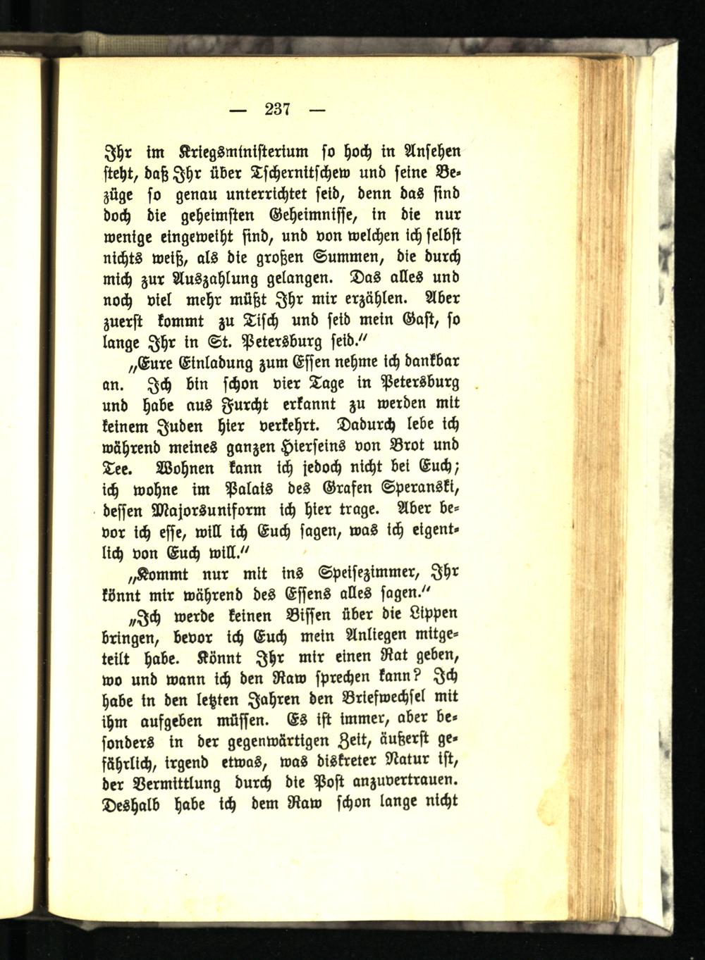 „Eure Einladung zum Essen nehme ich dankbar an. Ich bin schon vier Tage in Petersburg und habe aus Furcht erkannt zu werden mit keinem Juden hier verkehrt. Dadurch lebe ich während meines ganzen Hierseins von Brot und Tee. Wohnen kann ich jedoch nicht bei Euch) ich wohne im Palais des Grafen Speranskt, dessen Majorsuniform ich hier trage. Aber bevor ich esse, will ich Euch sagen, was ich eigentlich von Euch will."